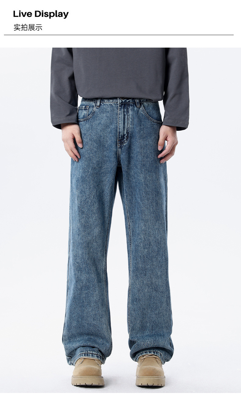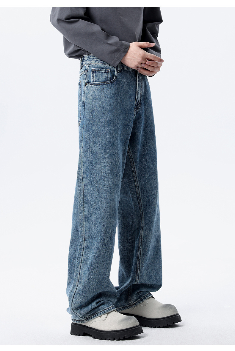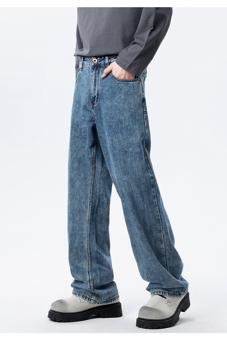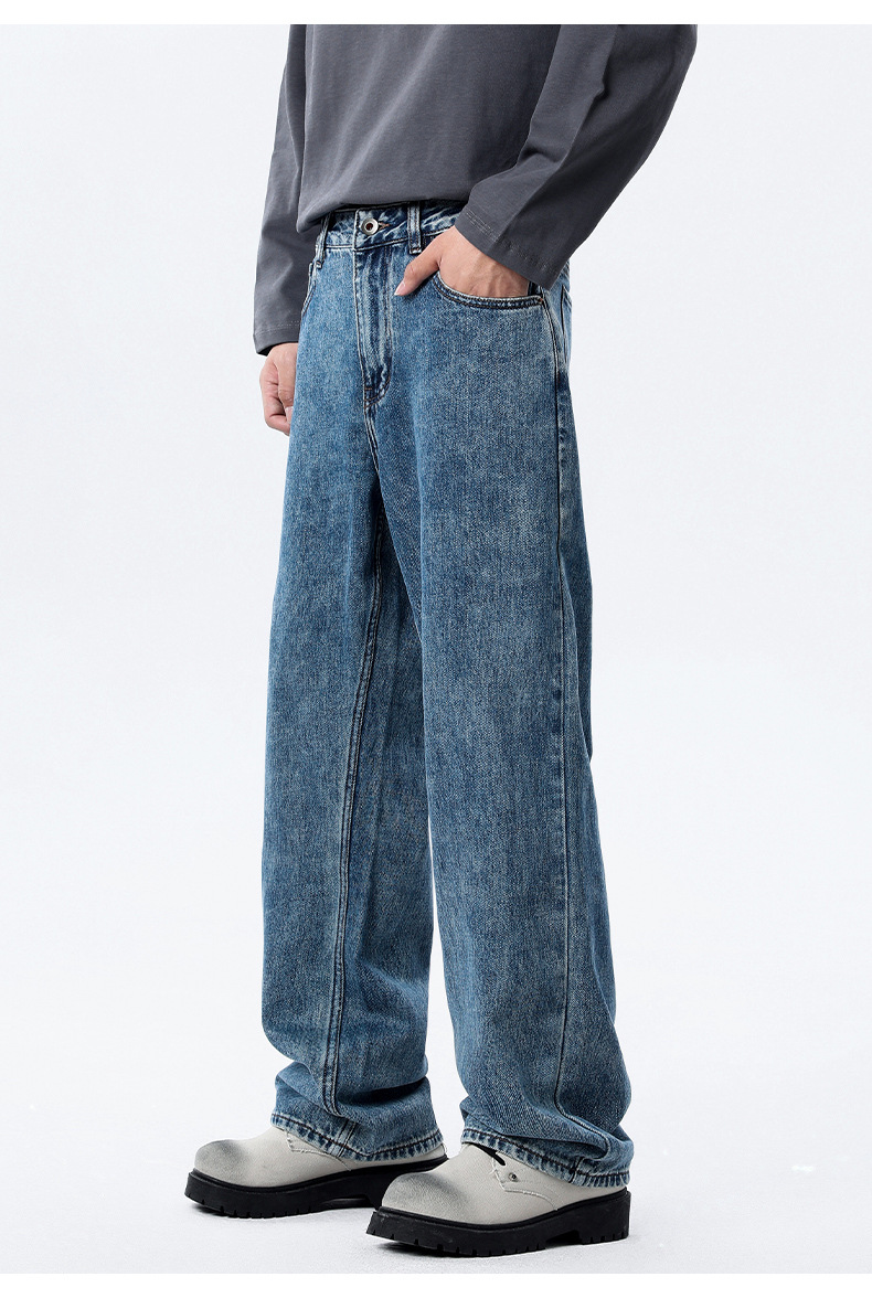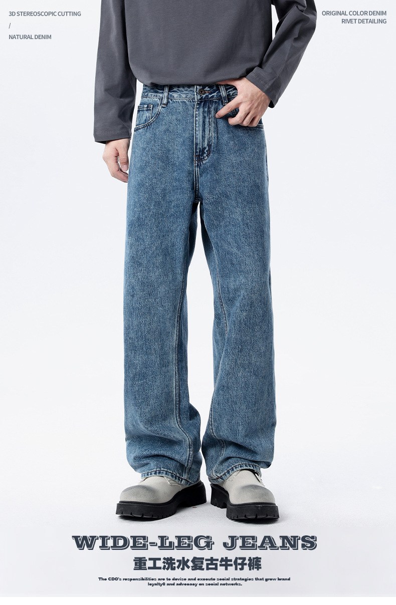 Men's Vintage Wide Leg Denim Jeans, Loose Fit, Washed Cotton Pants for Casual Autumn Style, 100% Cotton