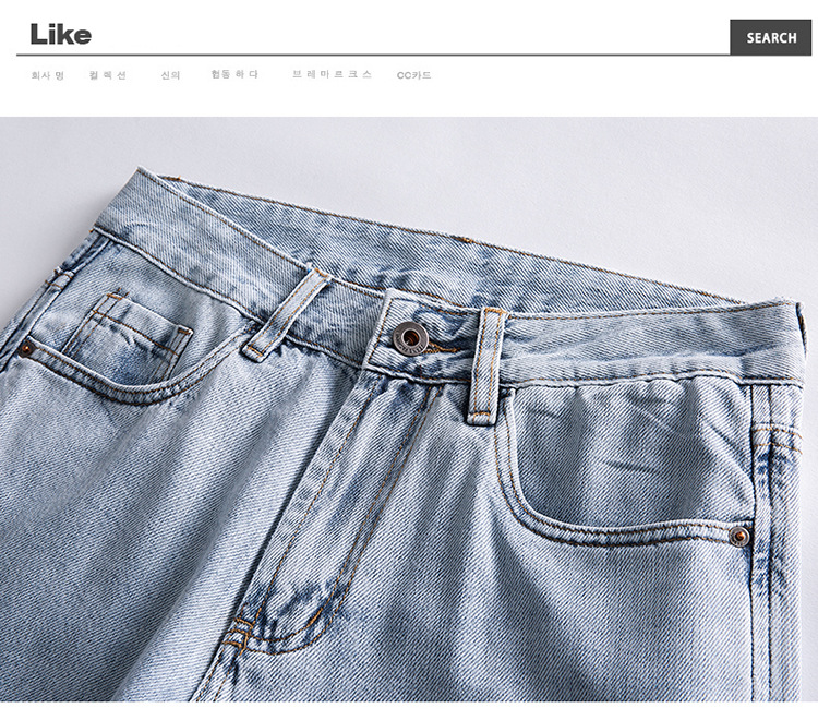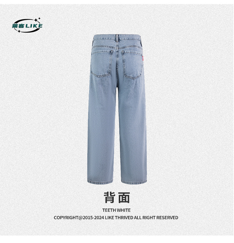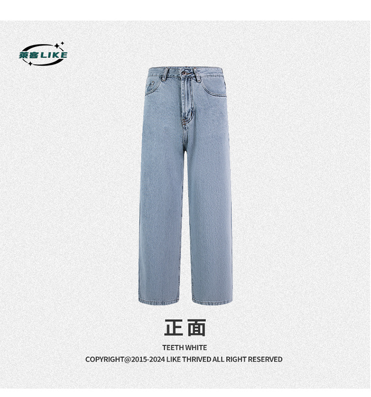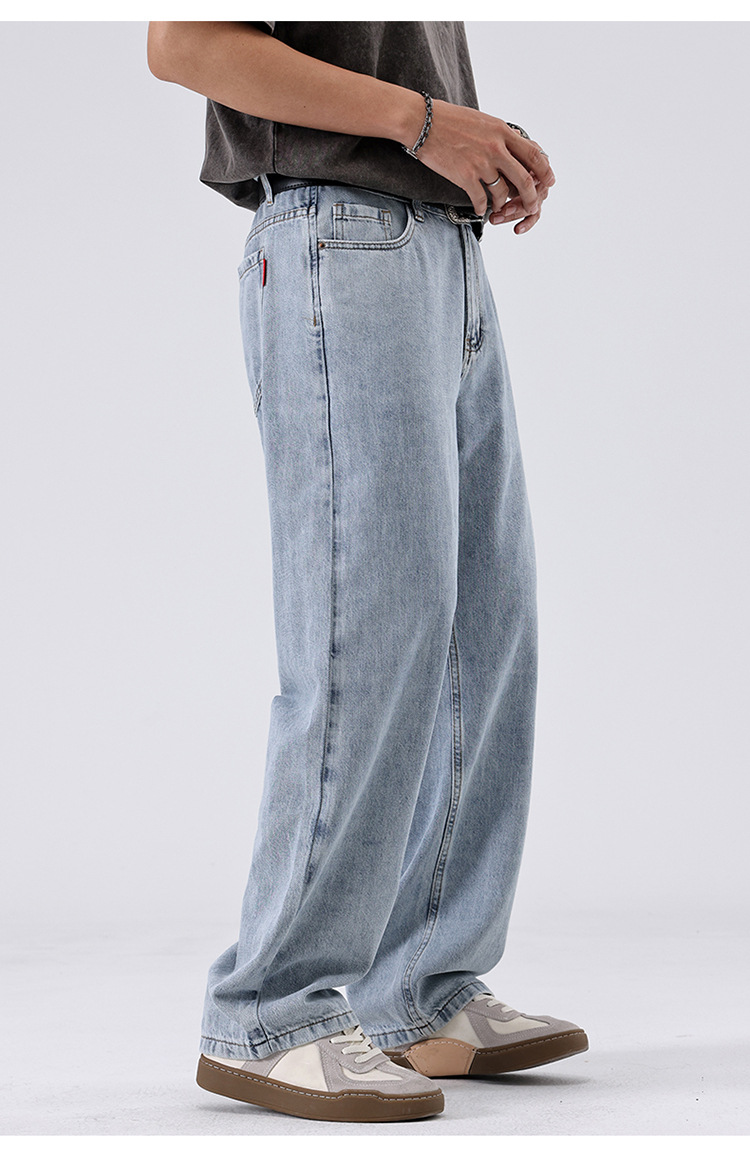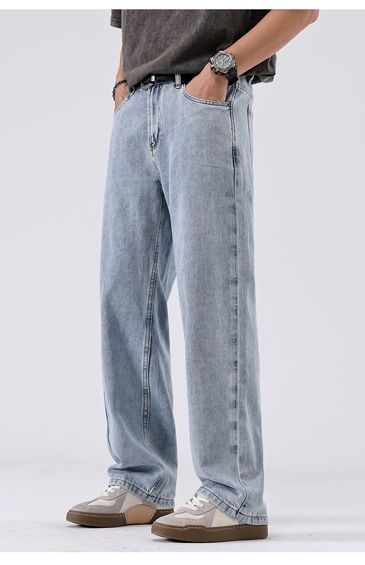 Jeans droit en denim bleu clair délavé, confortable et respirant pour le quotidien, idéal pour l'été, modèle pour adolescents.