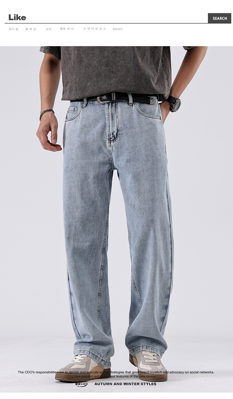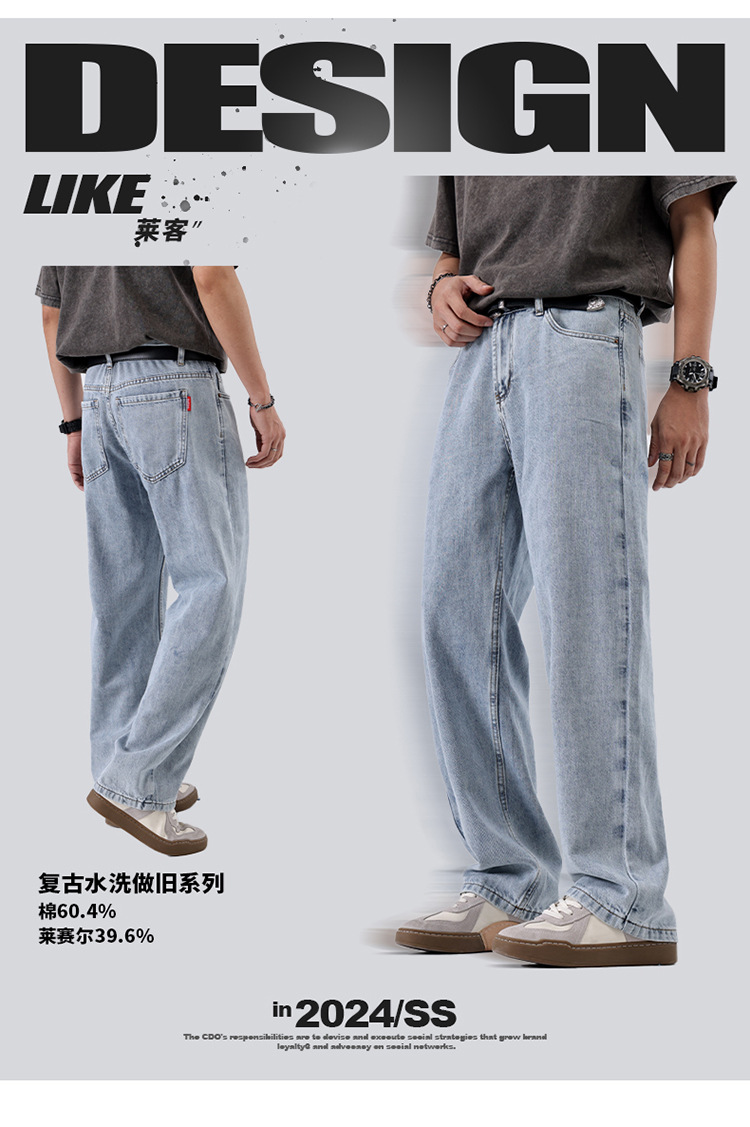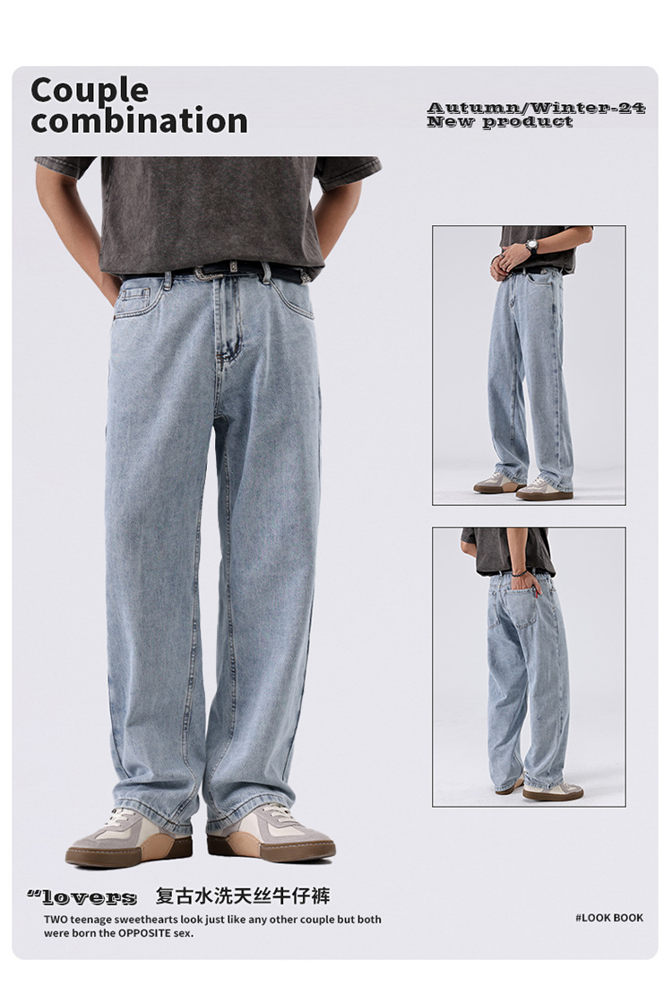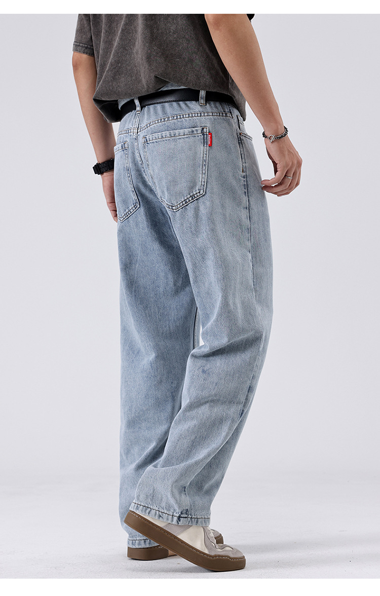 Jeans droit en denim bleu clair délavé, confortable et respirant pour le quotidien, idéal pour l'été, modèle pour adolescents.