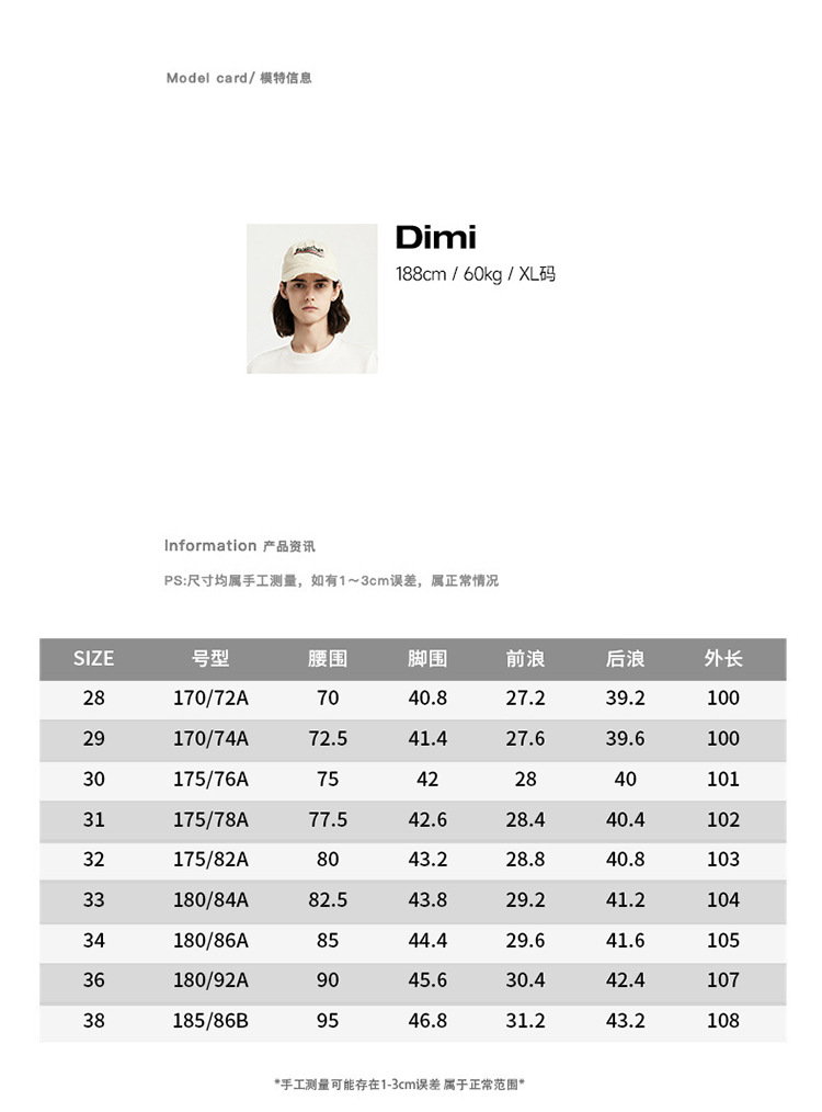 | 尺码 | 28(90-105斤),29(105-120斤),30(120-135斤),31(135-150斤),32(150-165斤),33(165-180斤),34(180-195斤),36(195-210斤),38(210-230斤) |