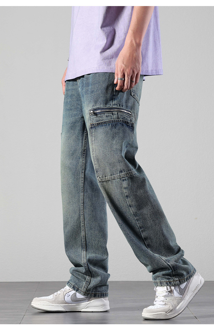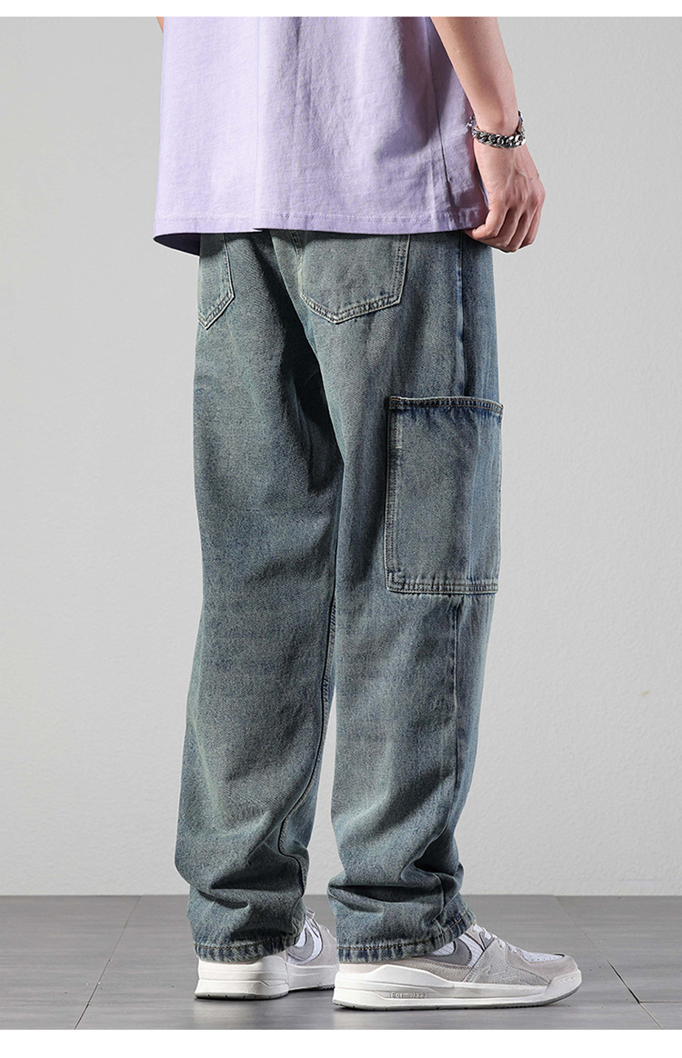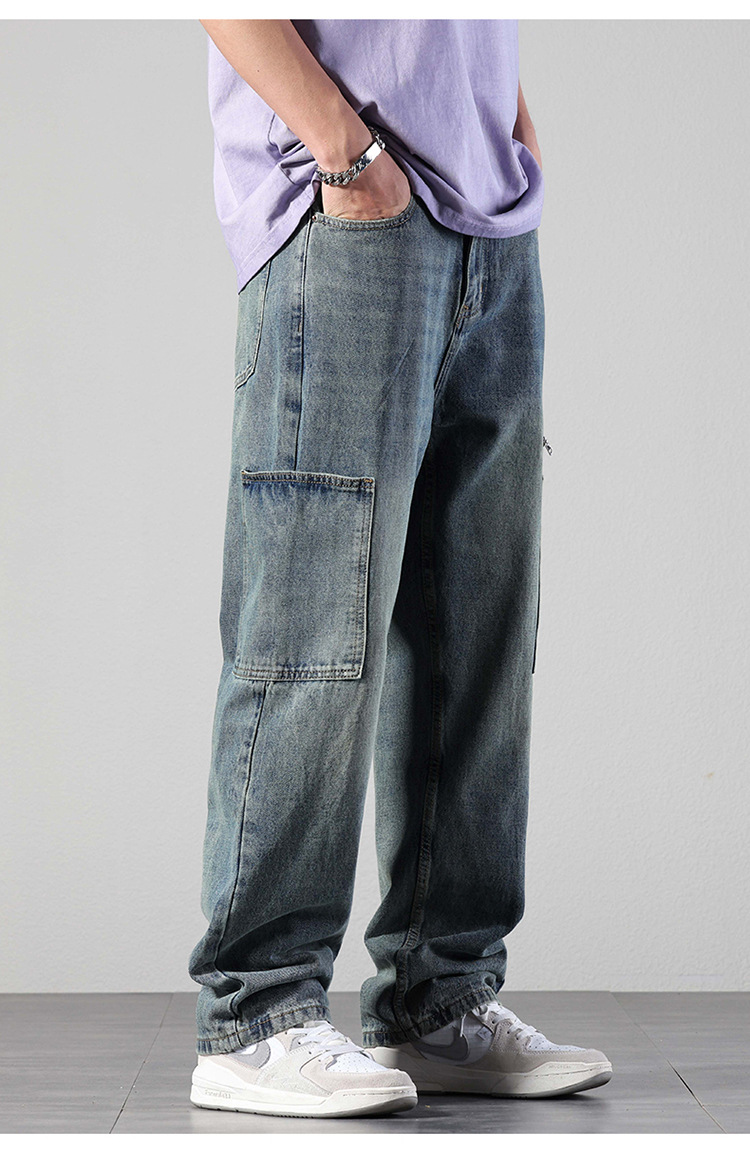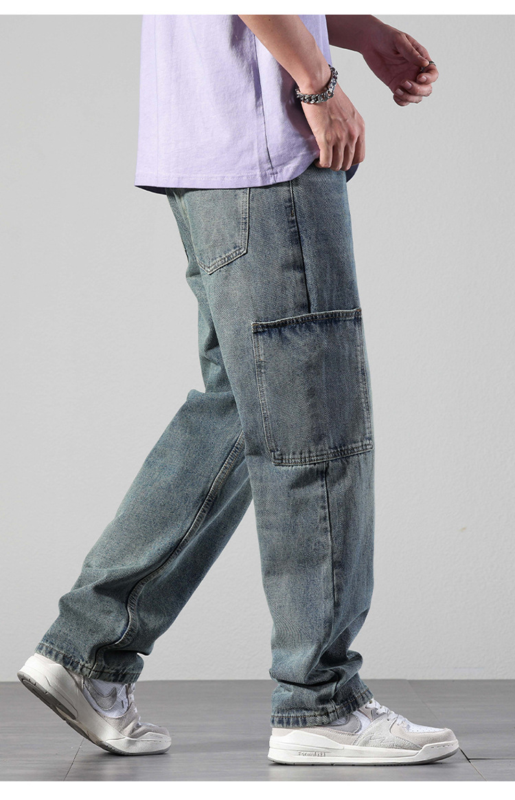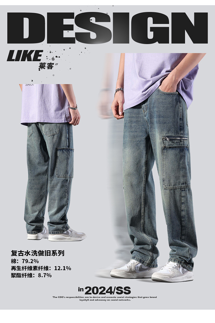 厂家直销男士宽松直筒休闲牛仔裤,夏季高街风格,多口袋水洗设计