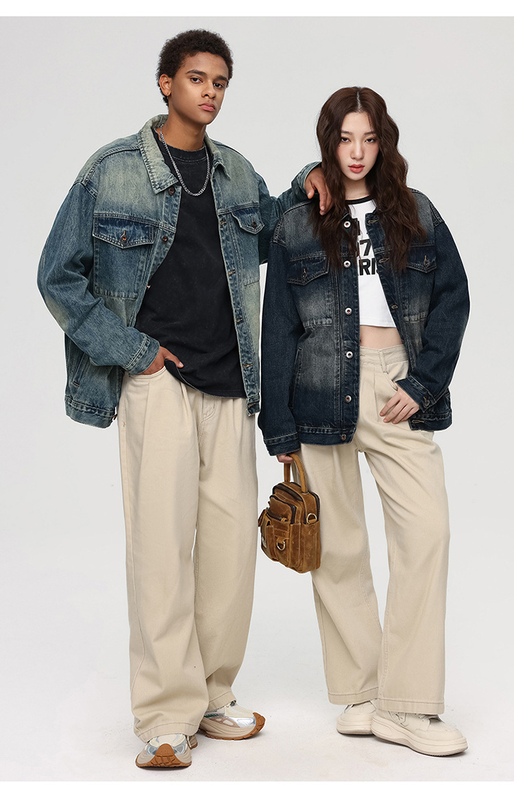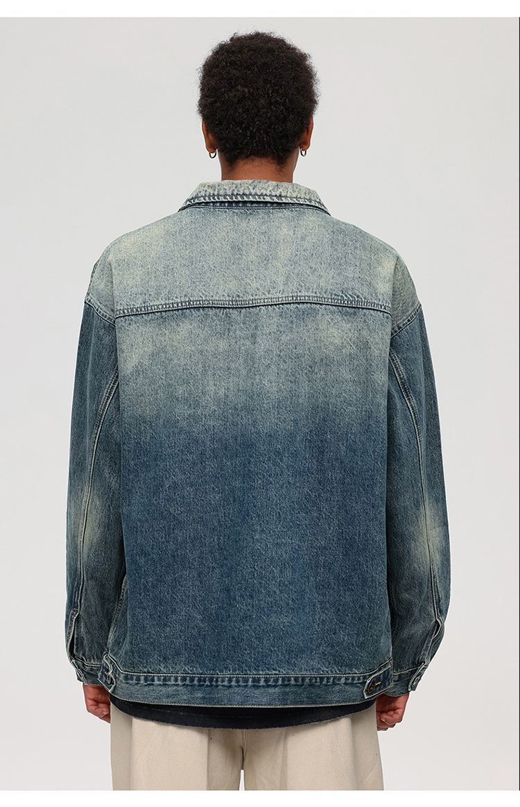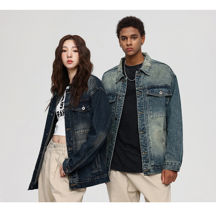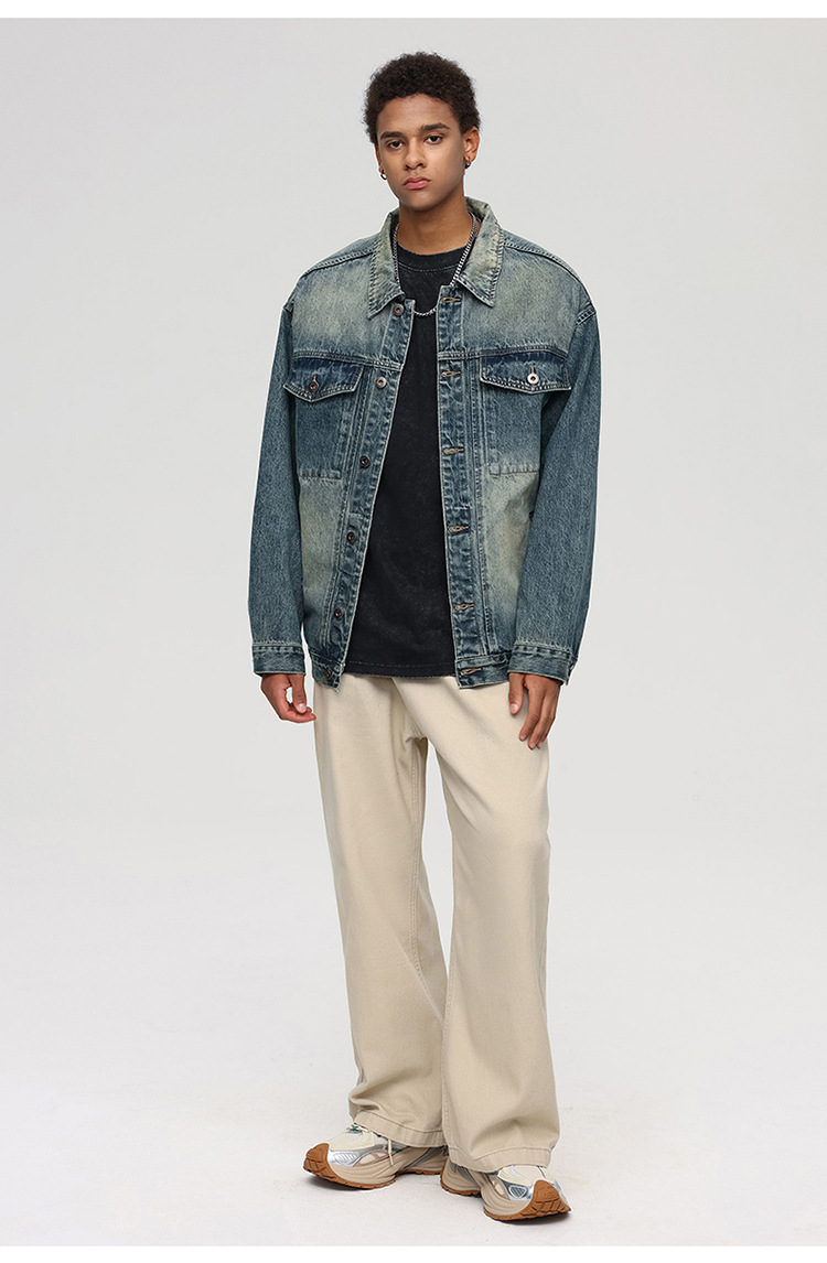 厂家直销男士宽松牛仔外套,春秋休闲美式风格,多口袋设计,街潮牛仔夹克