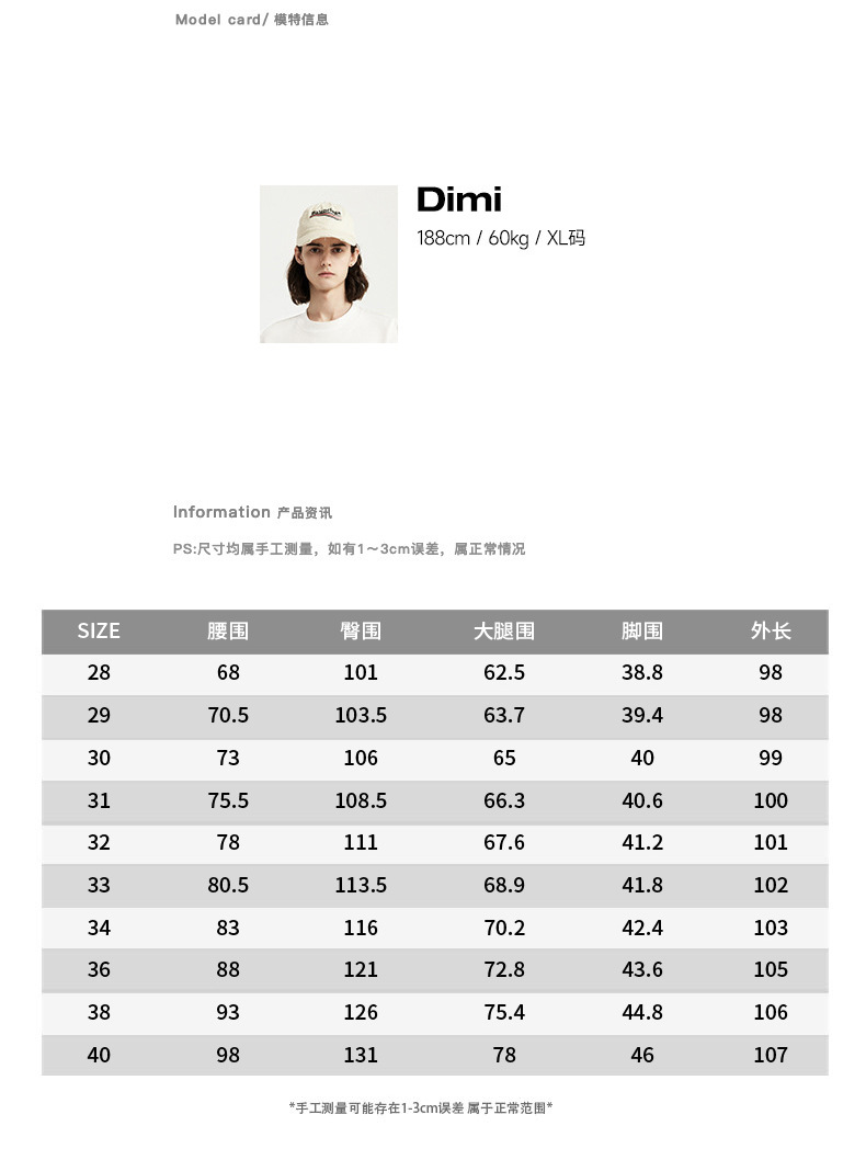 | 尺码 | 28(90-105斤),29(105-120斤),30(120-135斤),31(135-150斤),32(150-165斤),33(165-180斤),34(180-195斤),36(195-210斤),38(210-225斤),40(225-240斤) |