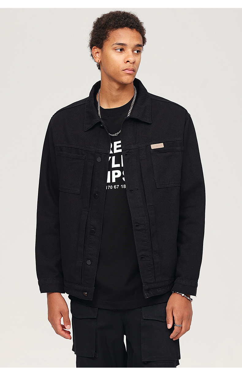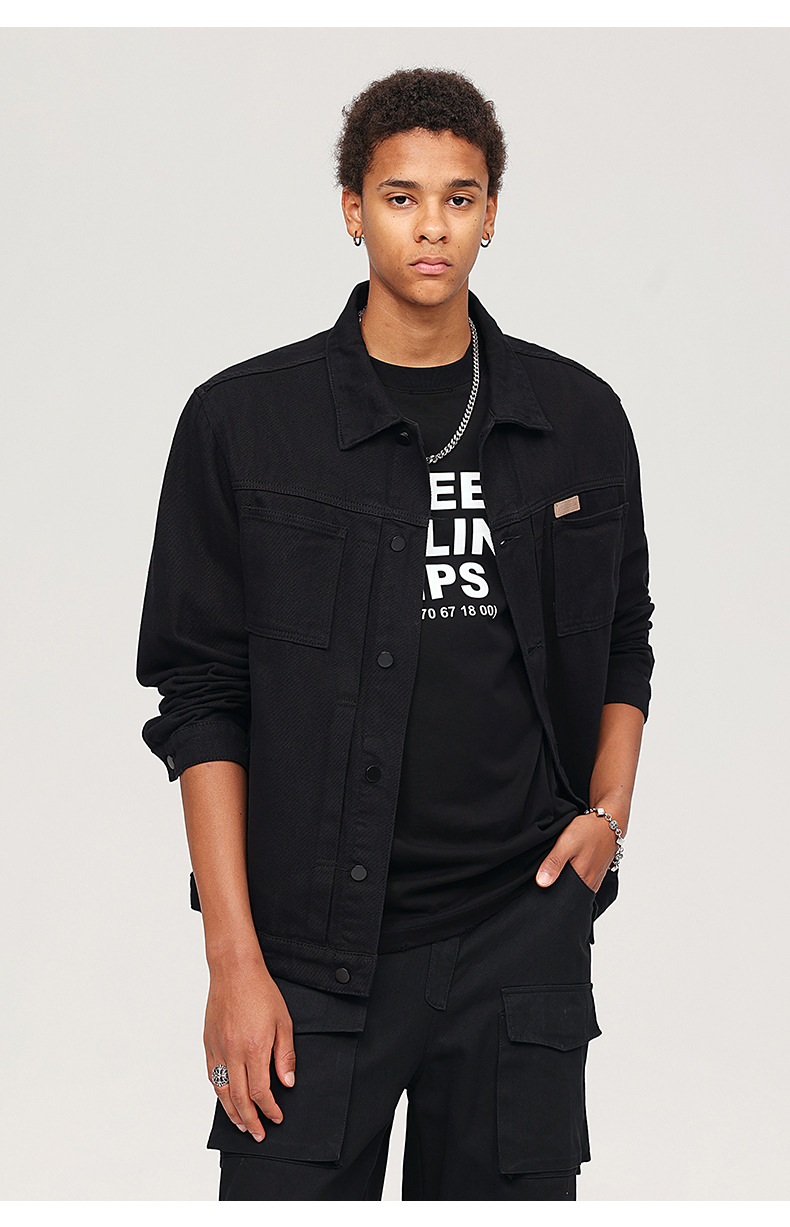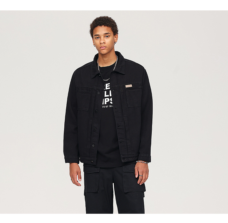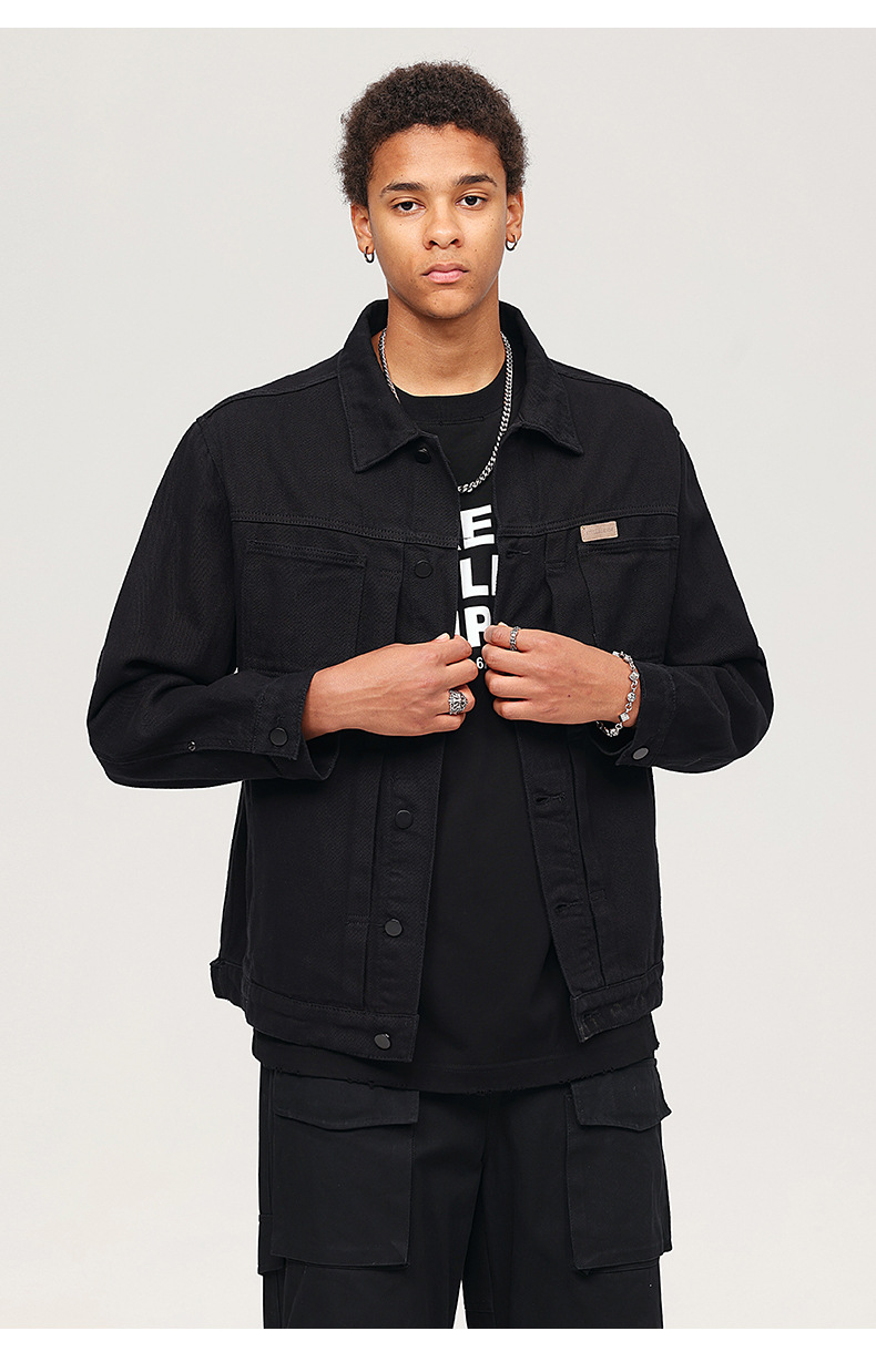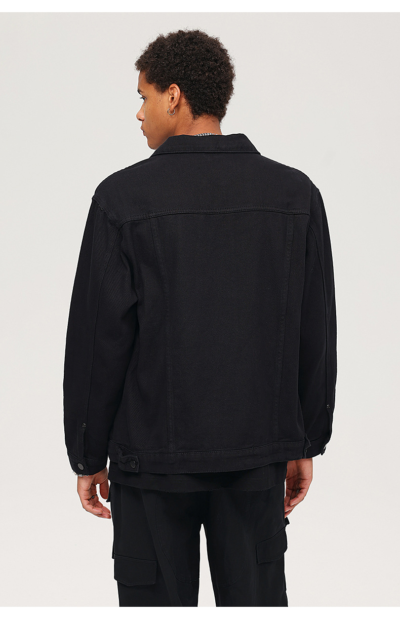 厂家直销男士复古黑色牛仔外套,宽松简约设计,适合春秋季日常穿着,耐磨面料,免烫处理