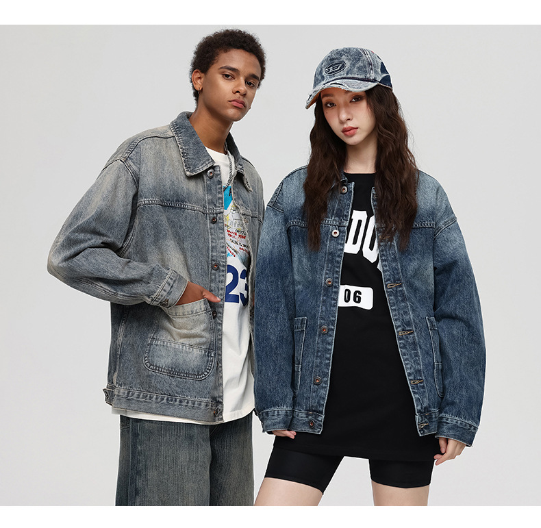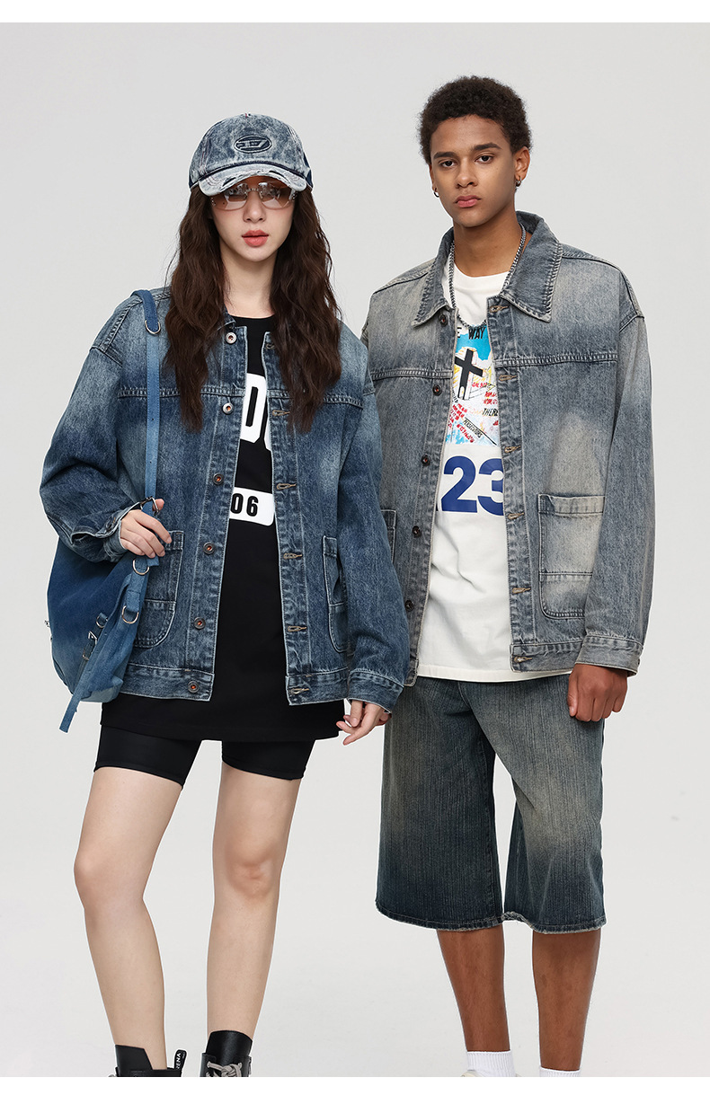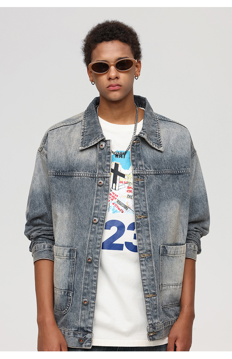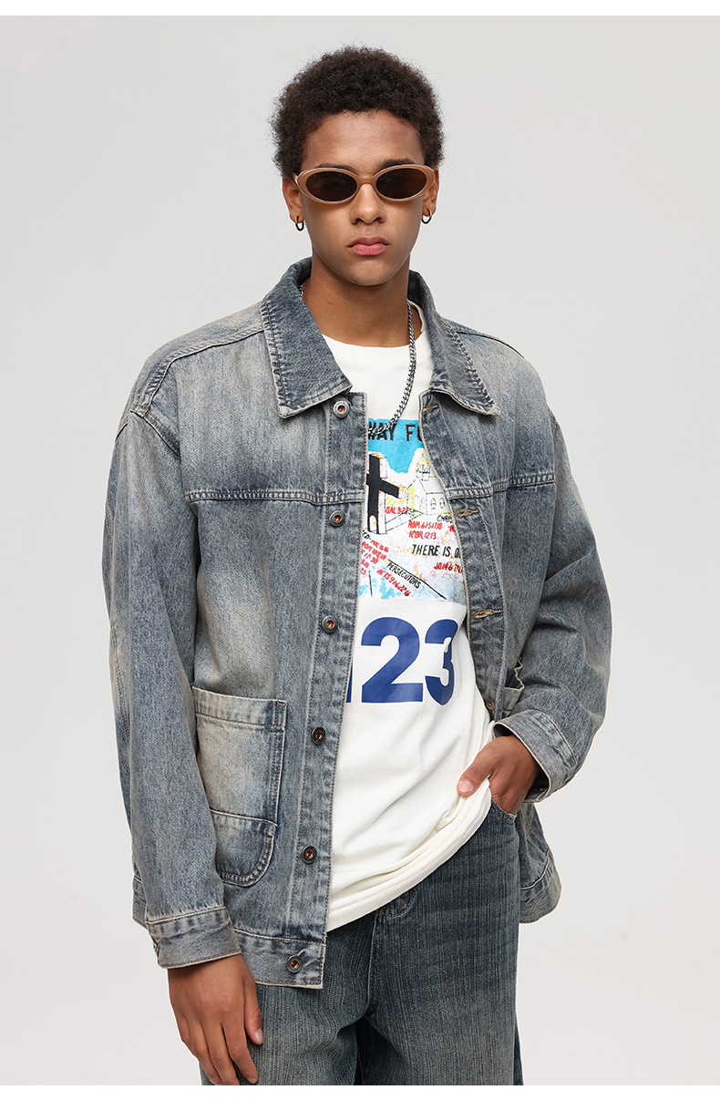 厂家直销青年宽松水洗做旧牛仔外套,春秋休闲风格,多口袋设计