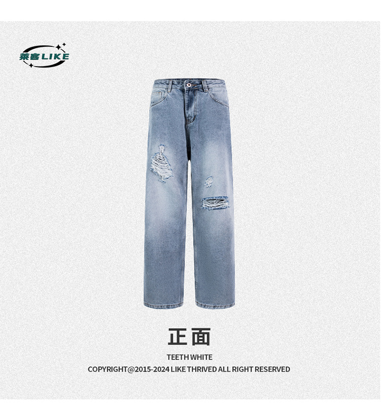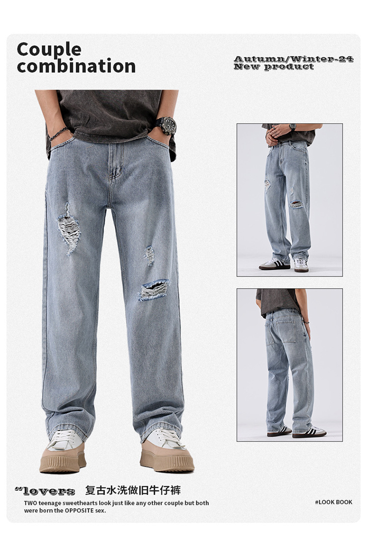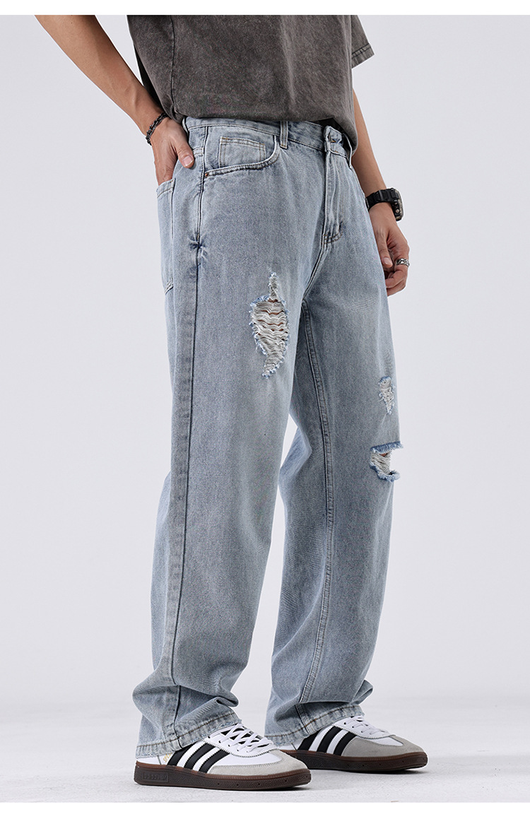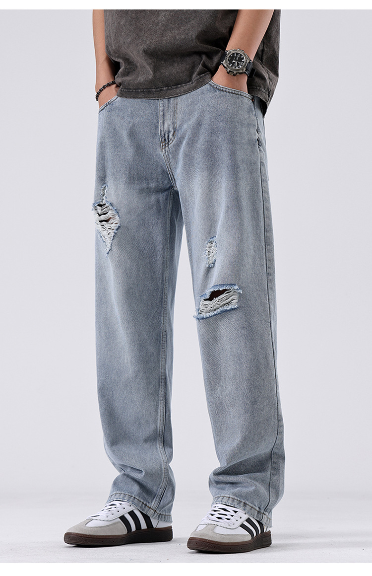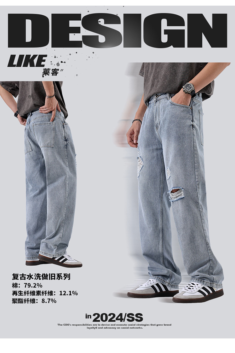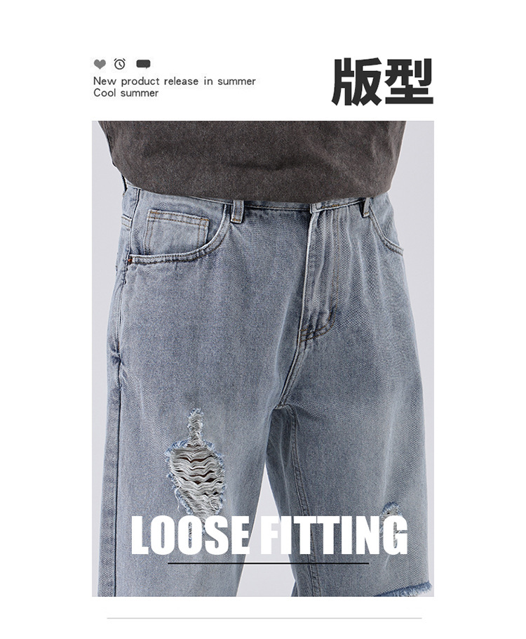 厂家直销男士宽松破洞牛仔裤,夏季休闲直筒长裤,多口袋水洗工艺