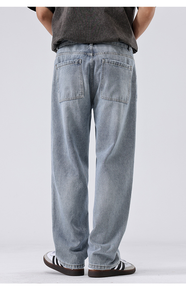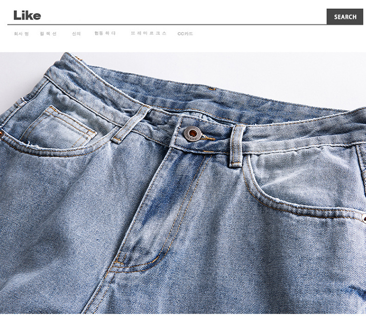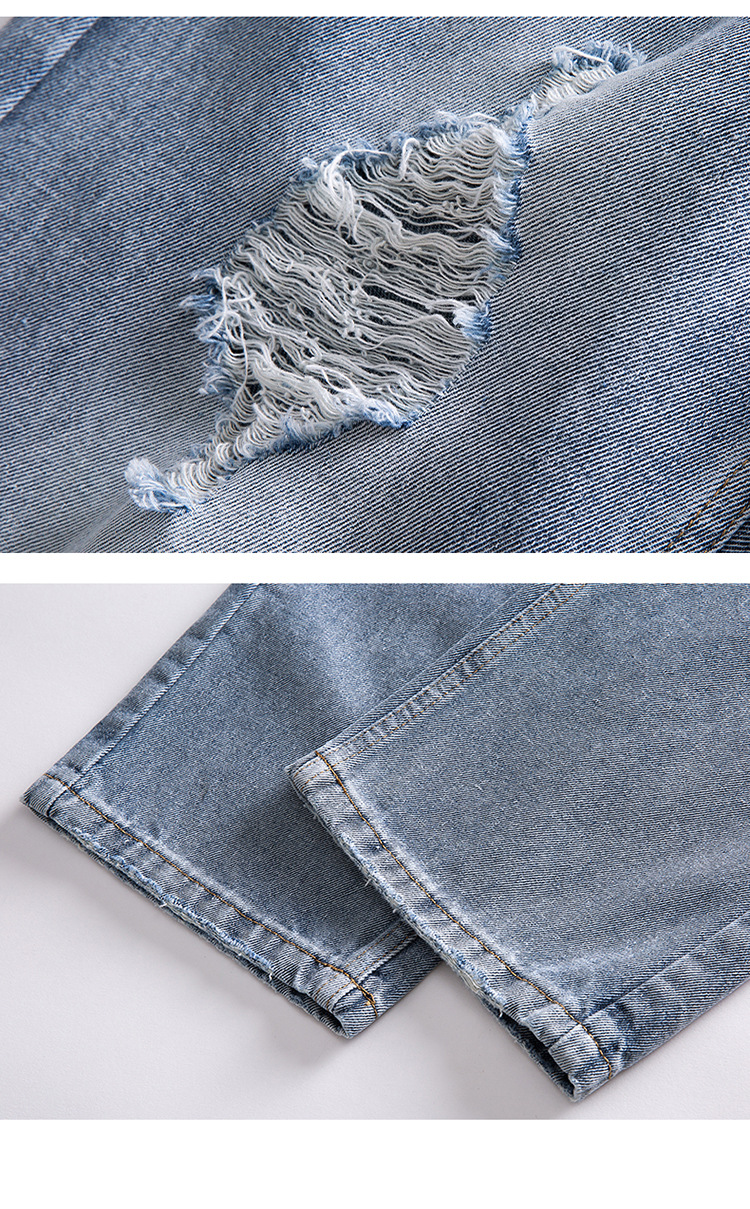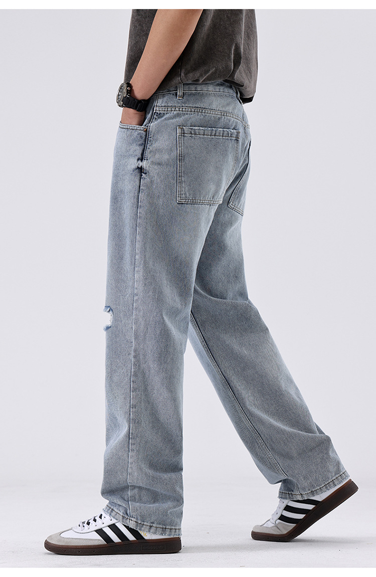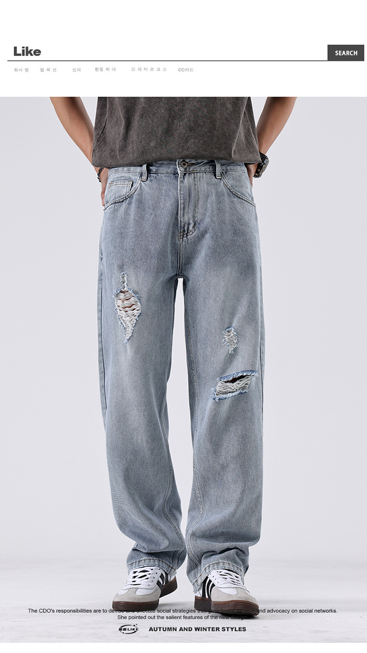 厂家直销男士宽松破洞牛仔裤,夏季休闲直筒长裤,多口袋水洗工艺