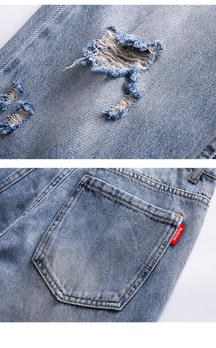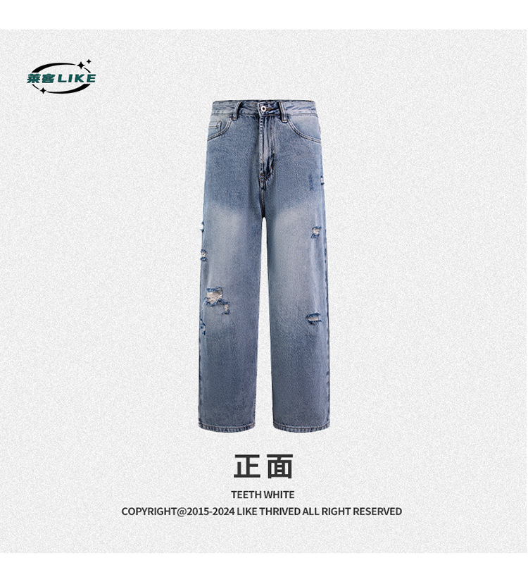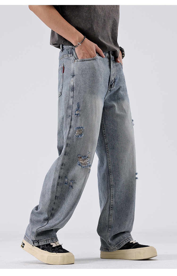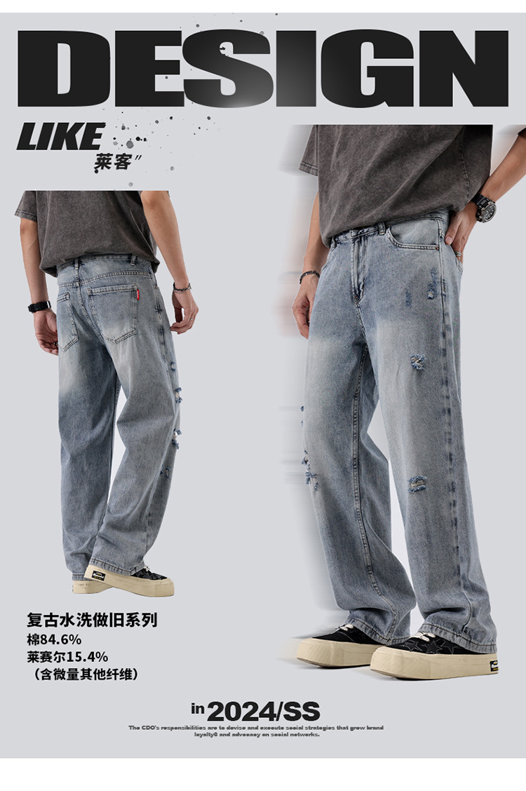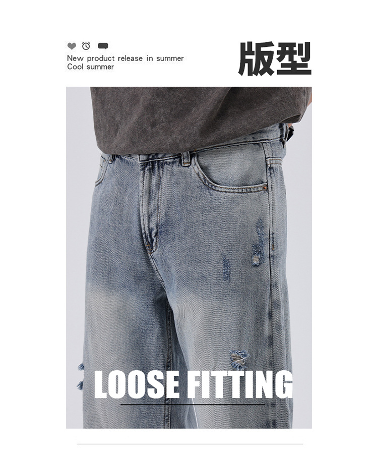 厂家直销男士宽松破洞牛仔裤,夏季休闲长裤,水洗工艺直筒设计