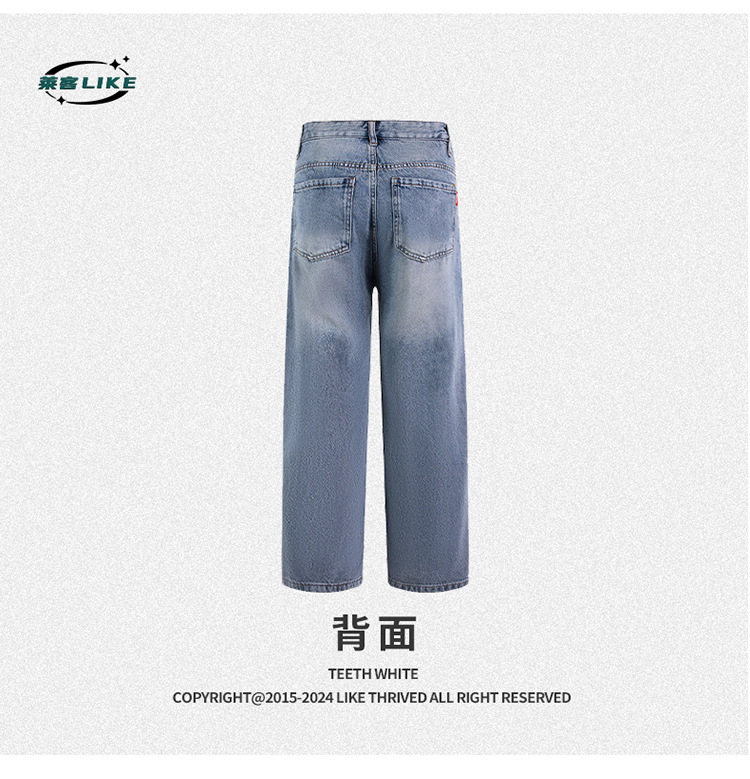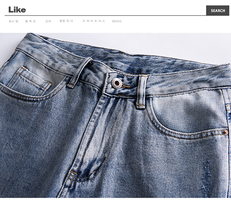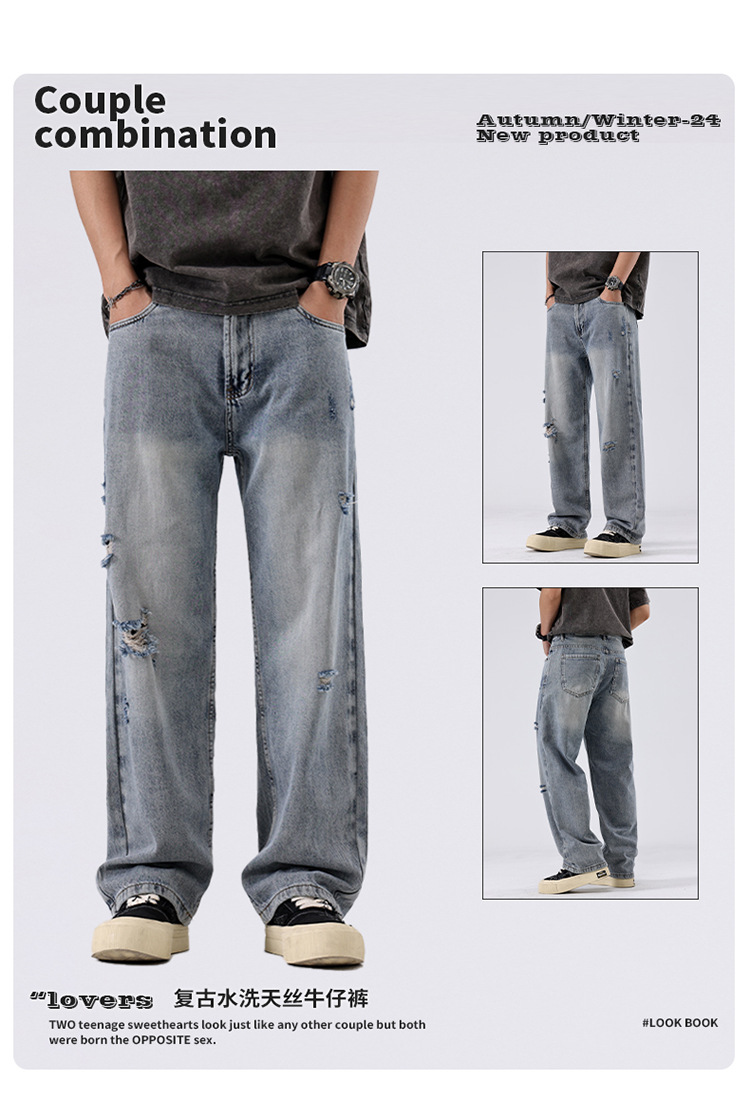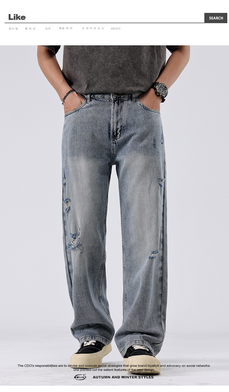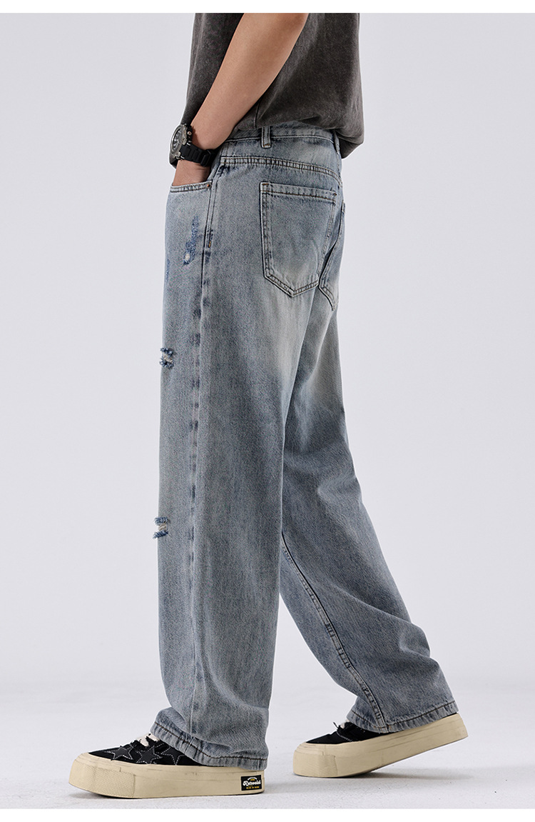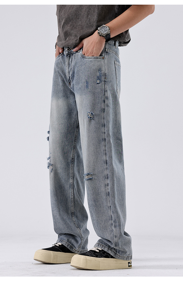 厂家直销男士宽松破洞牛仔裤,夏季休闲长裤,水洗工艺直筒设计