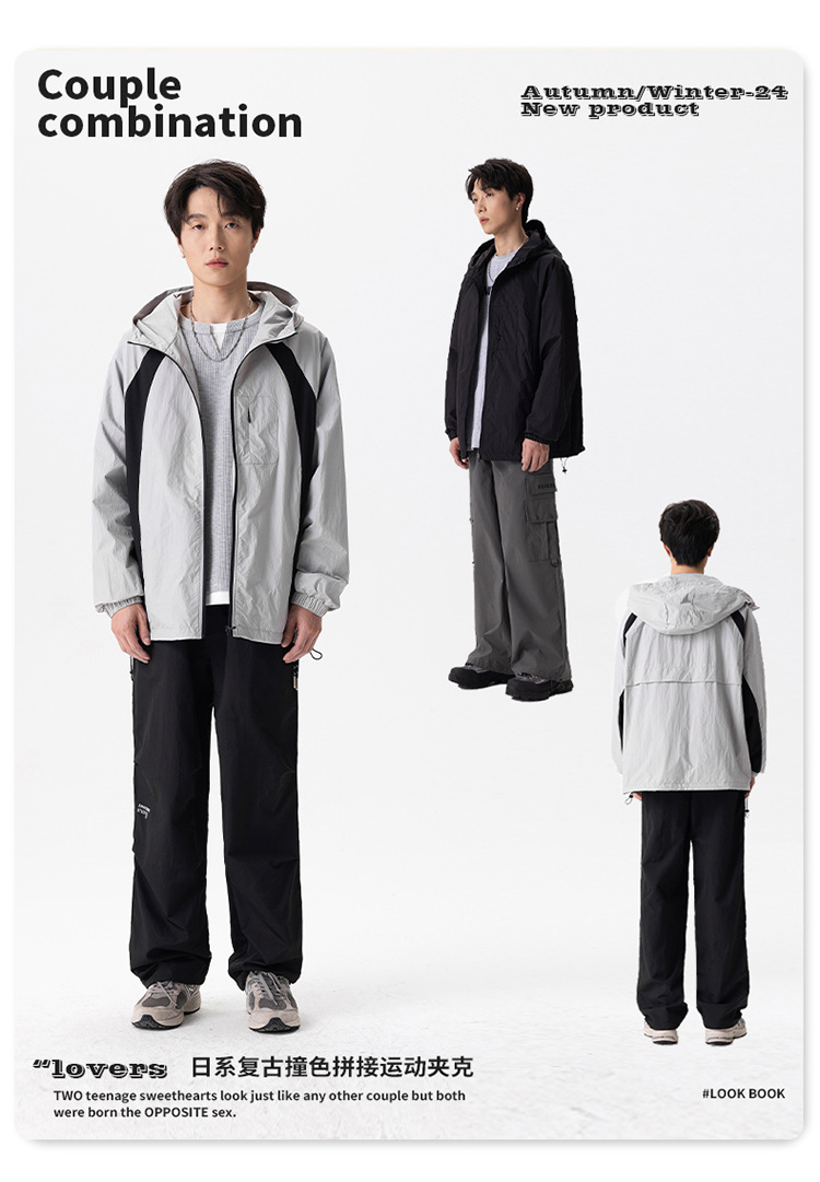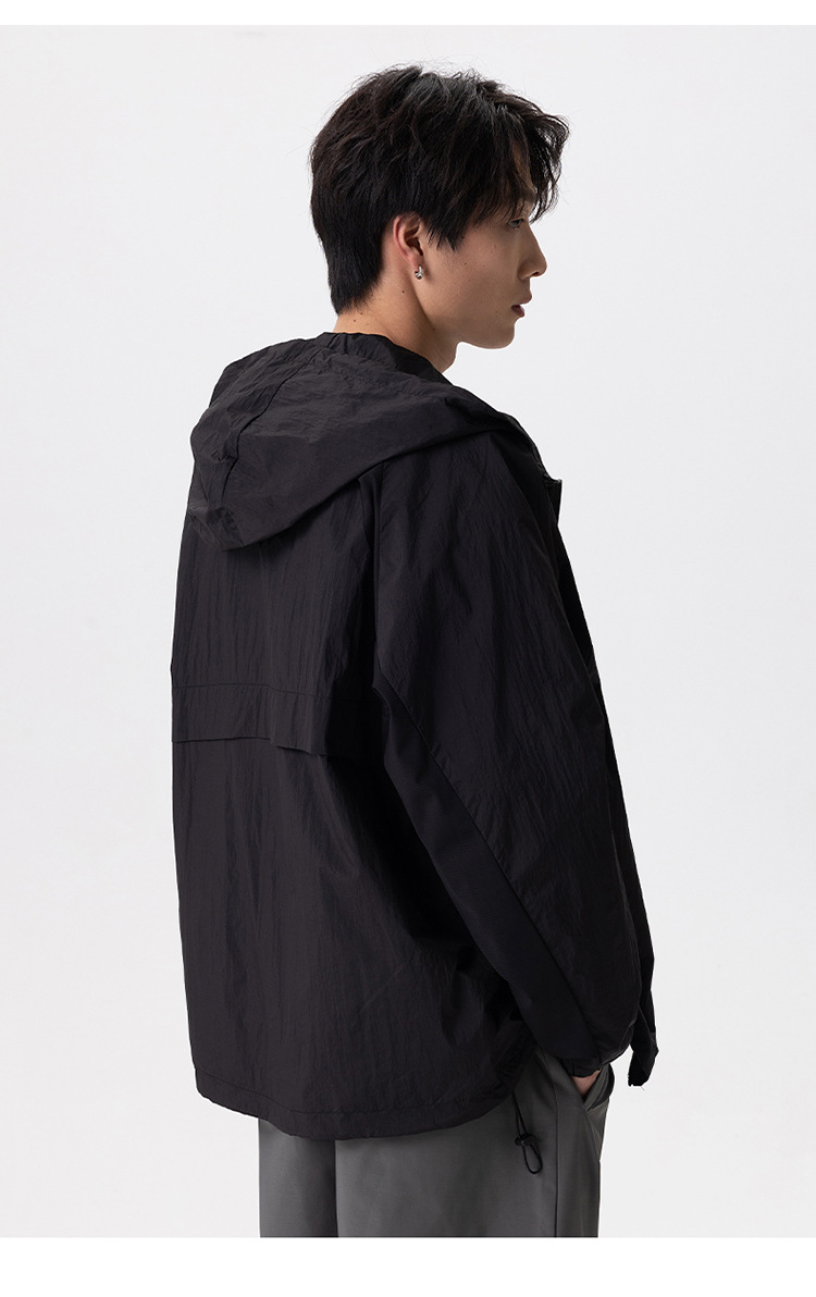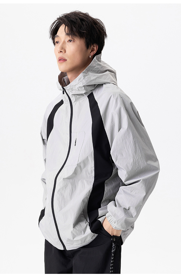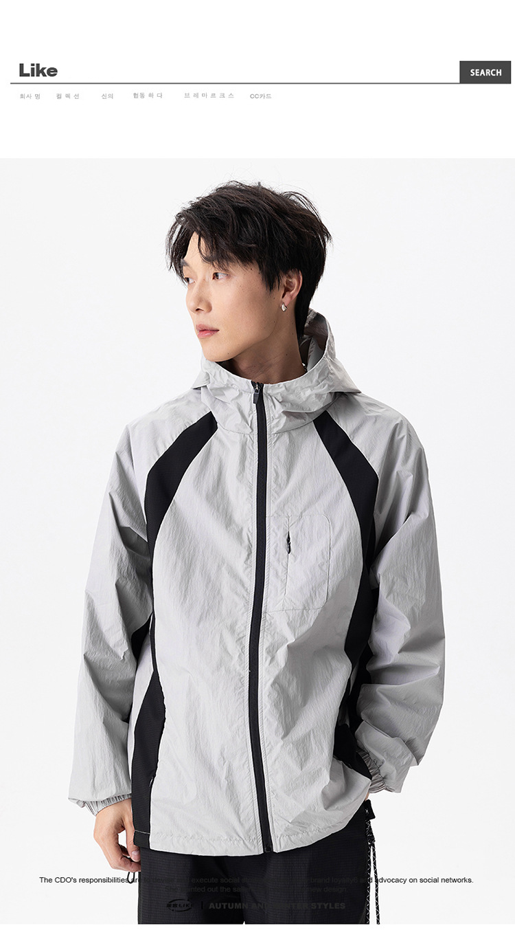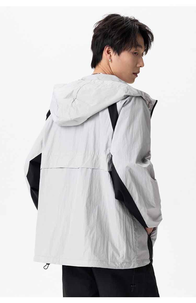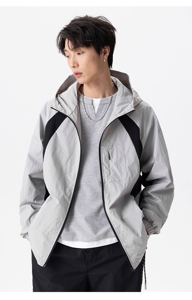 厂家直销男士高街风格薄款连帽夹克,宽松版型,休闲春秋,拼色设计,耐磨功能