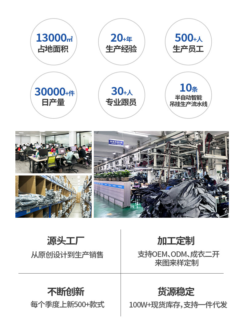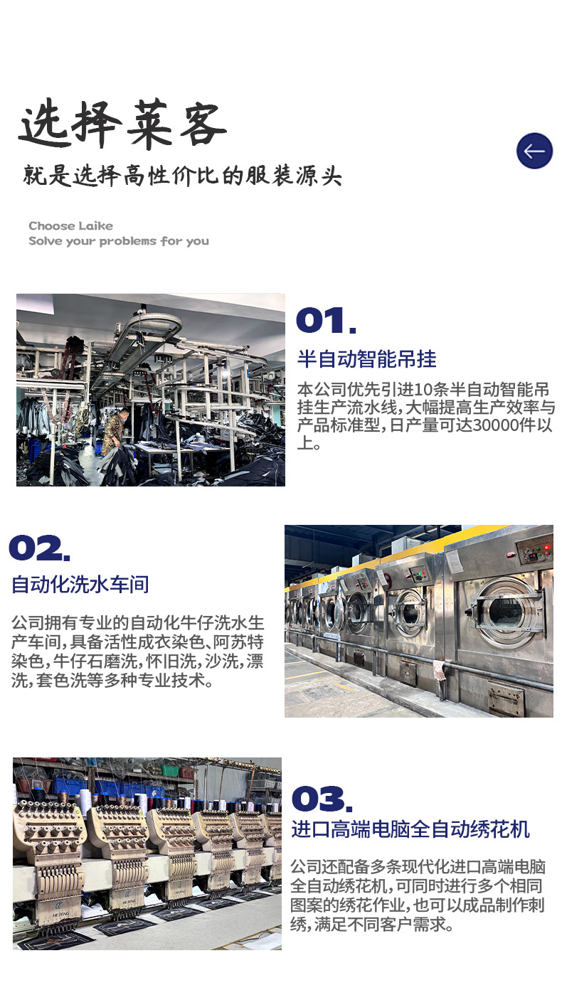 广州莱客服饰有限公司成立于2004年,坐落于广州牛仔产业核心区——新塘。我们专注于牛仔与休闲服饰的设计、生产与出口,年产量超200万件,产品远销欧洲、北美、东南亚等50多个国家和地区。