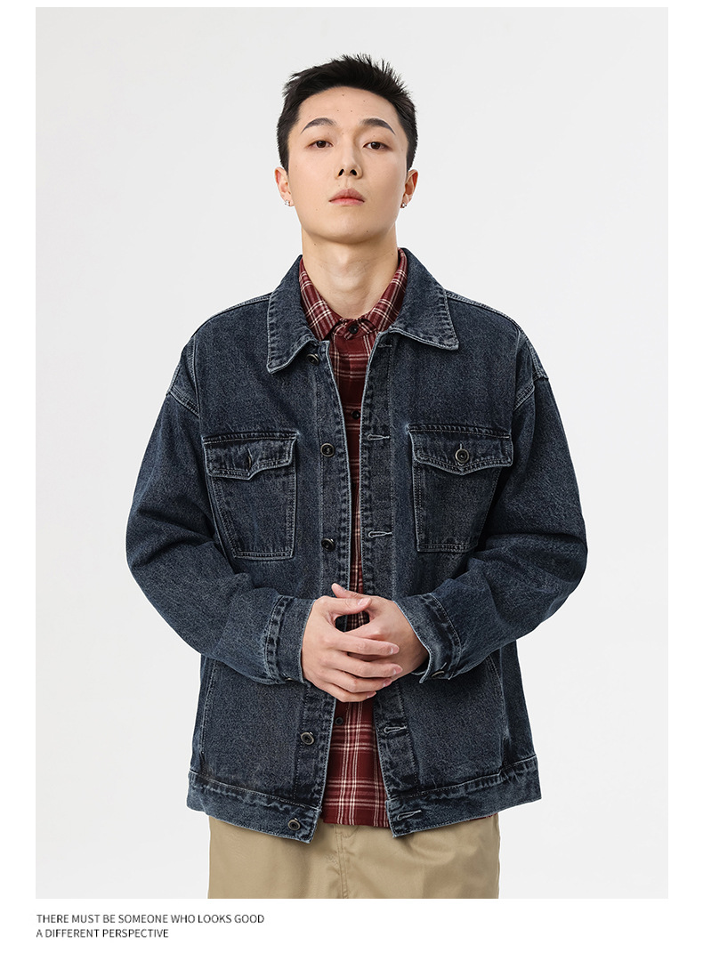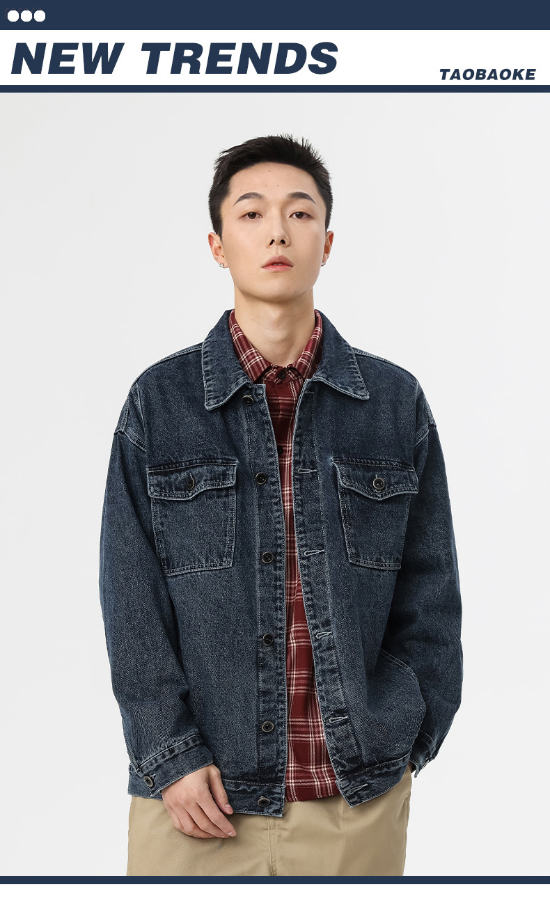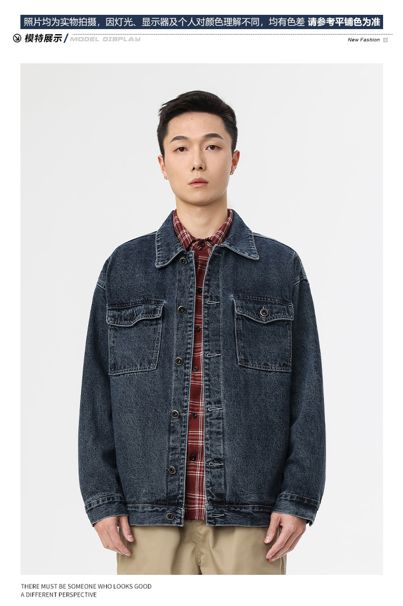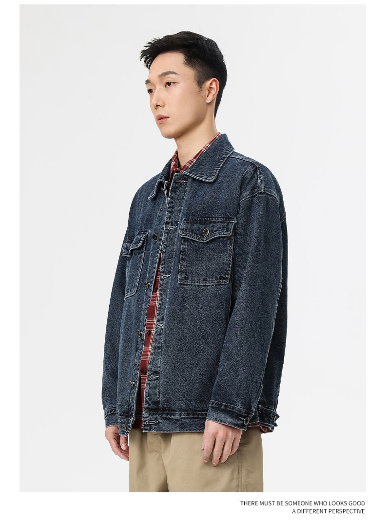 厂家直销男士牛仔外套,复古蓝色宽松版型,时尚都市风格,适合春秋季,耐磨防撕裂设计