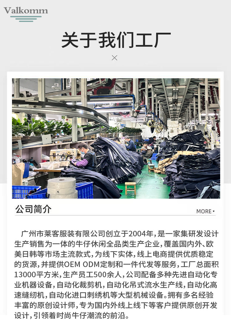 广州莱客服饰有限公司成立于2004年,坐落于广州牛仔产业核心区——新塘。我们专注于牛仔与休闲服饰的设计、生产与出口,年产量超200万件,产品远销欧洲、北美、东南亚等50多个国家和地区。