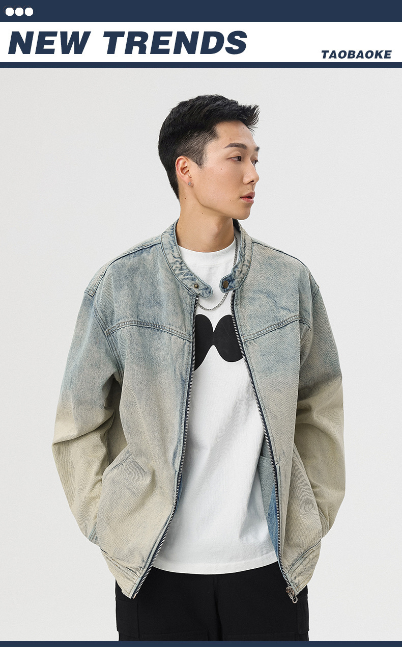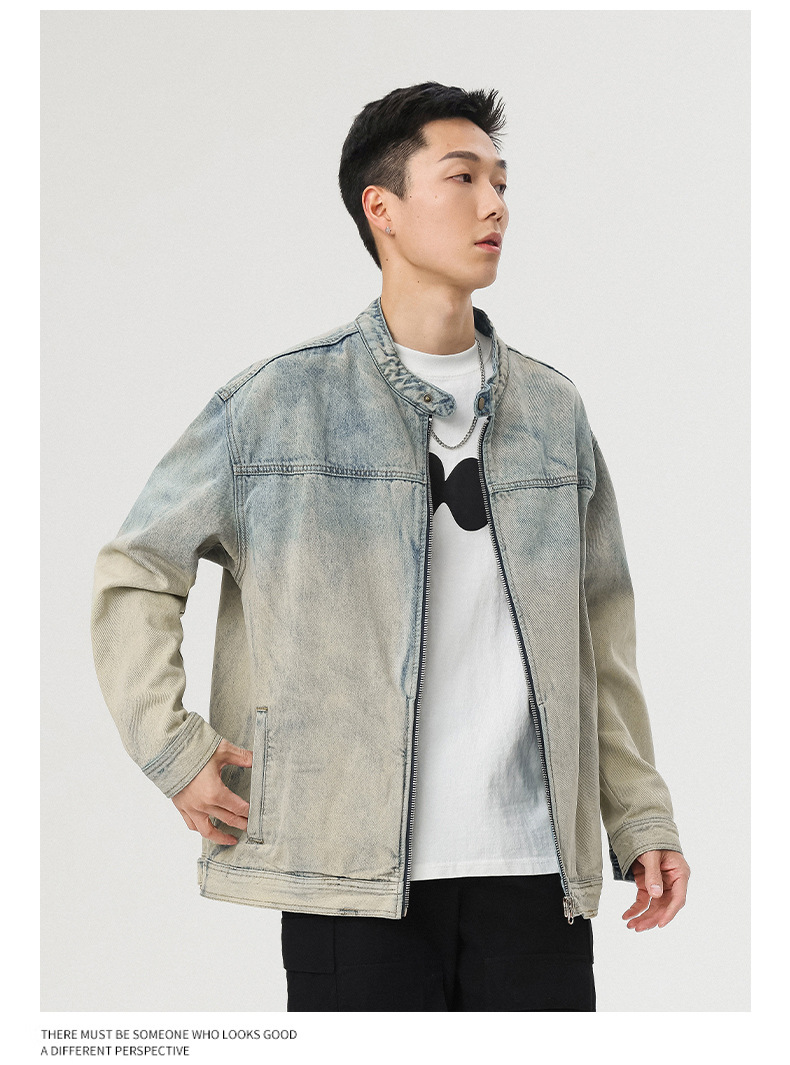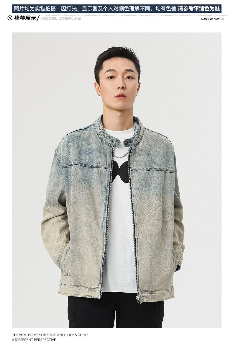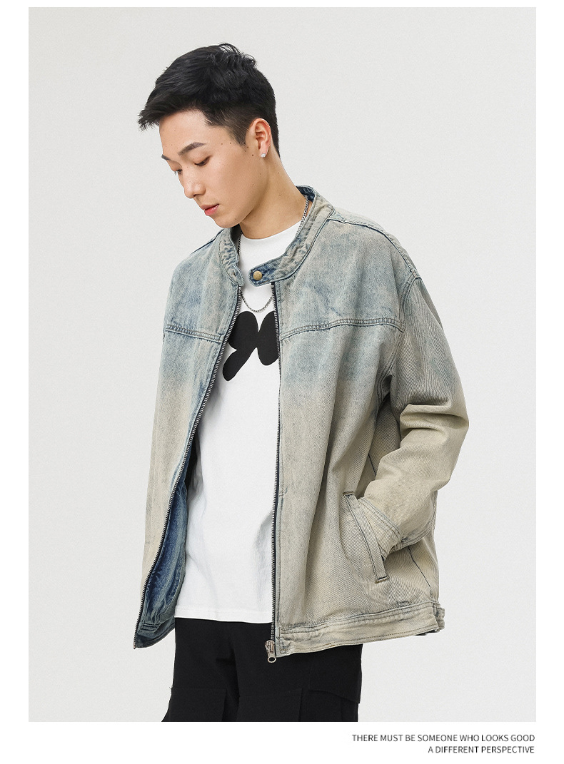 厂家直销男士美式复古宽松牛仔外套,春秋休闲款,耐磨防风设计,拉链开合多口袋