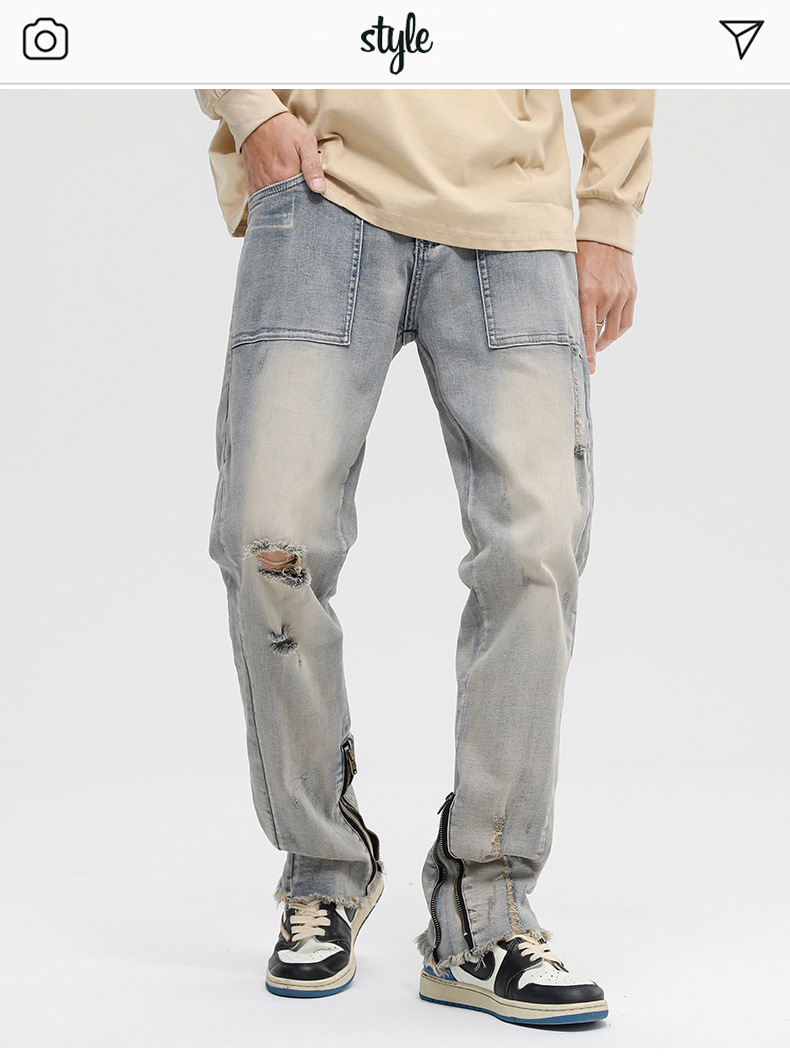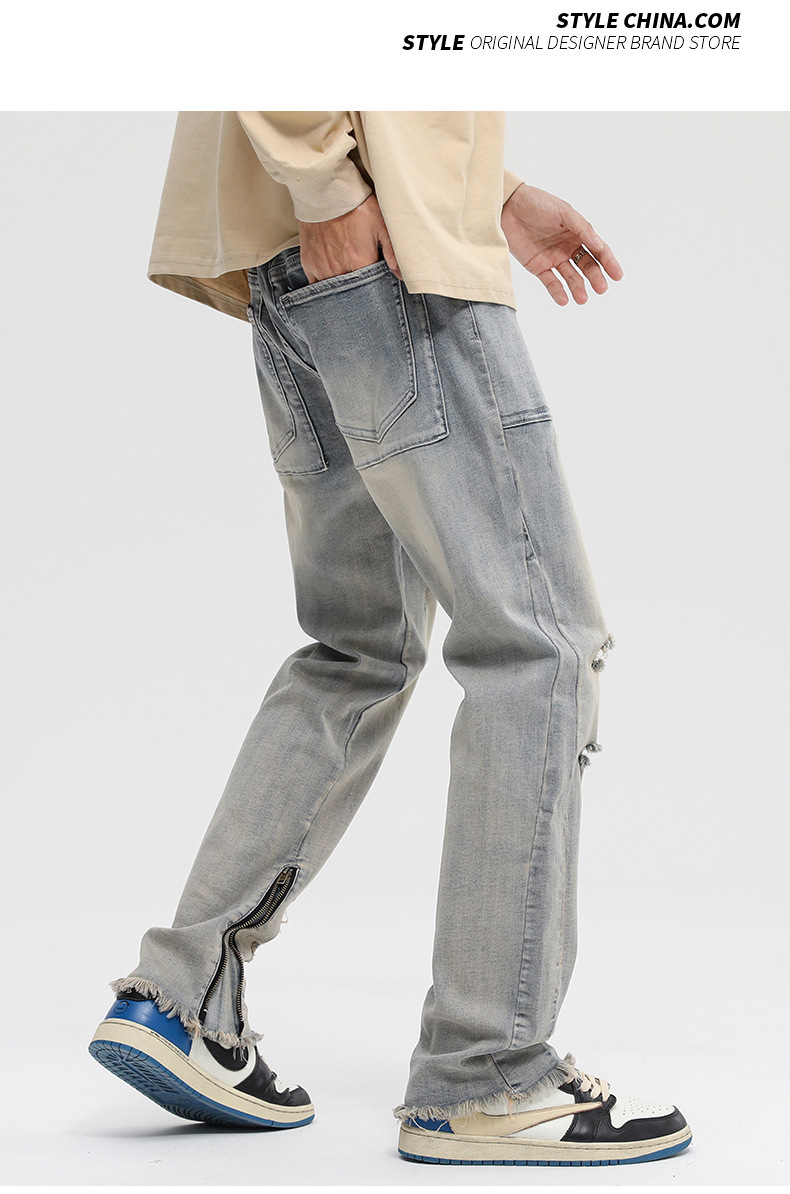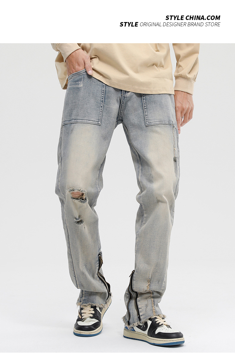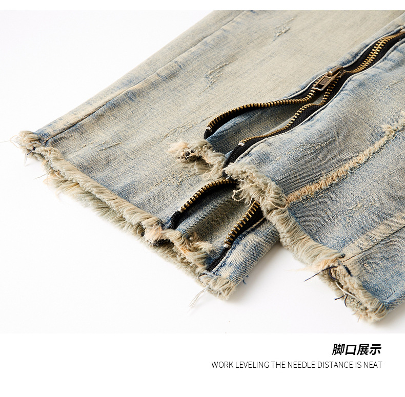 厂家直销男士破洞嘻哈风格牛仔裤,春秋休闲,水洗做旧长裤,拉链开襟设计