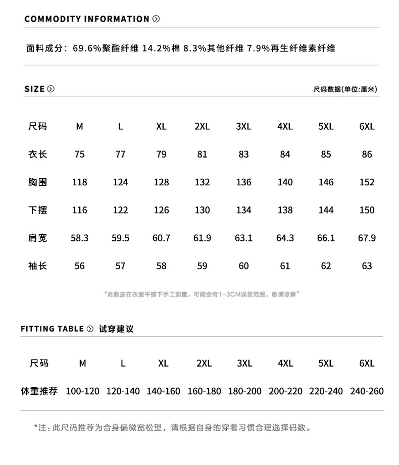 | 主面料成分的含量 | 69.6%聚酯纤维 14.2%棉 8.3%其他纤维 7.9%再生纤维素纤维 |