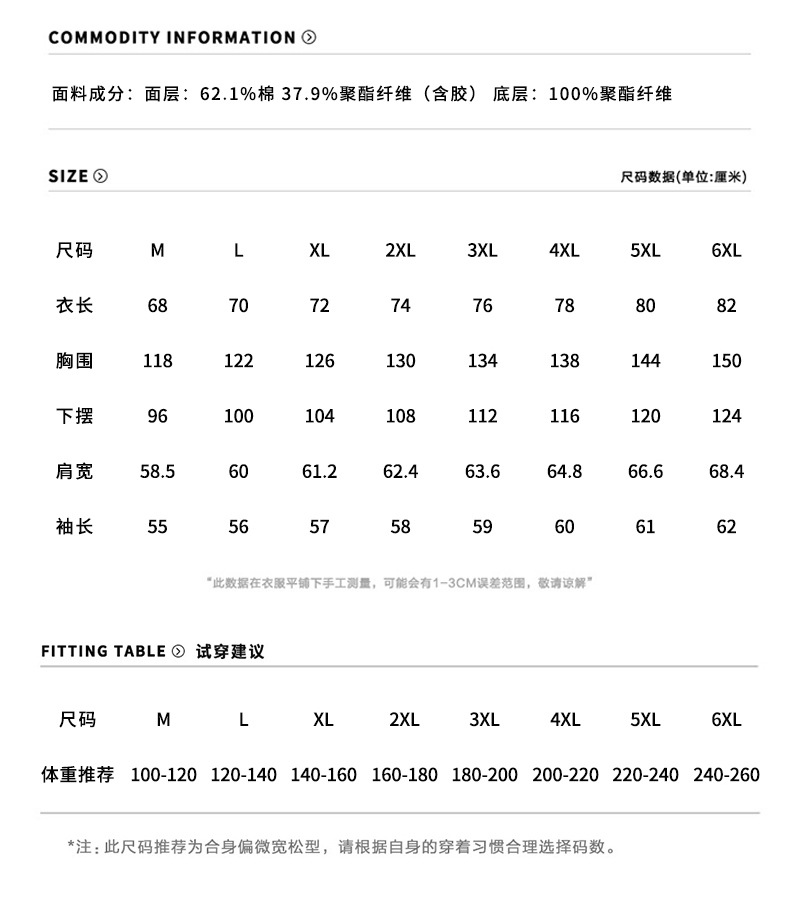 | 主面料成分的含量 | 62.1%棉 37.9%聚酯纤维 |