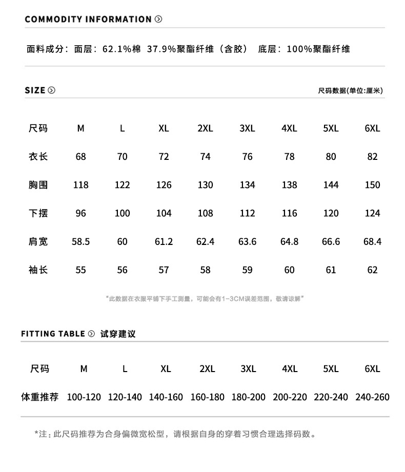 | 主面料成分的含量 | 62.1%棉 37.9%聚酯纤维 |