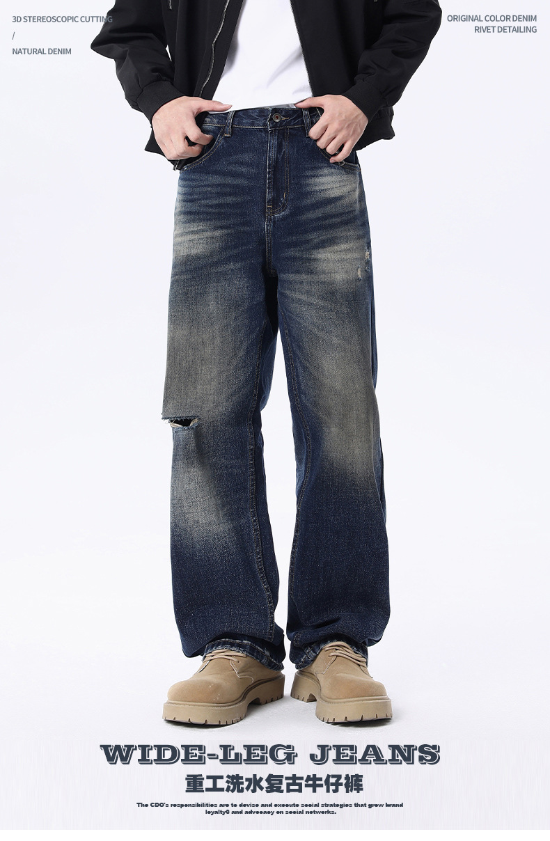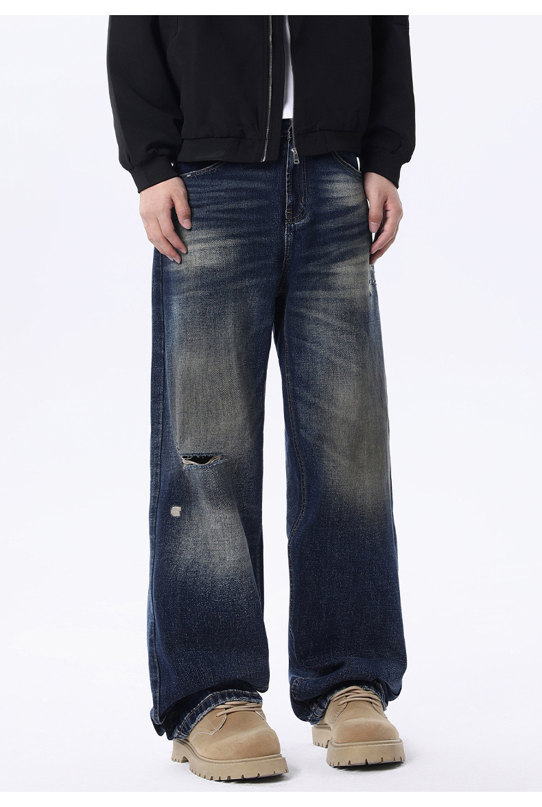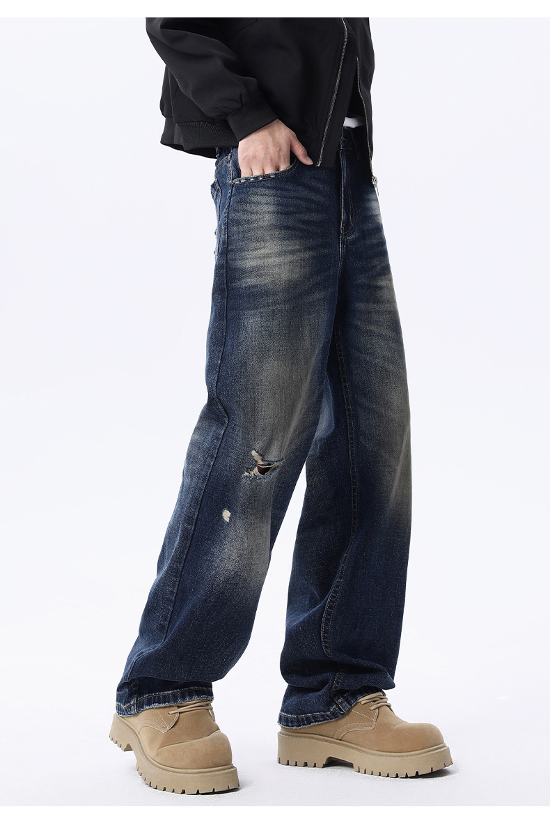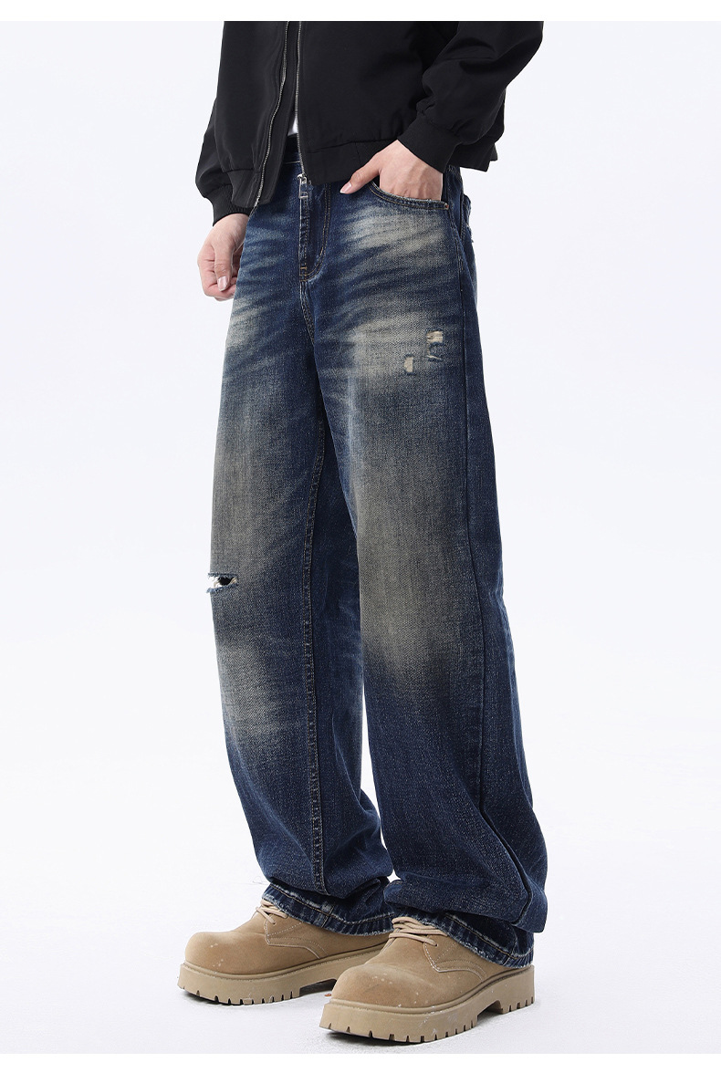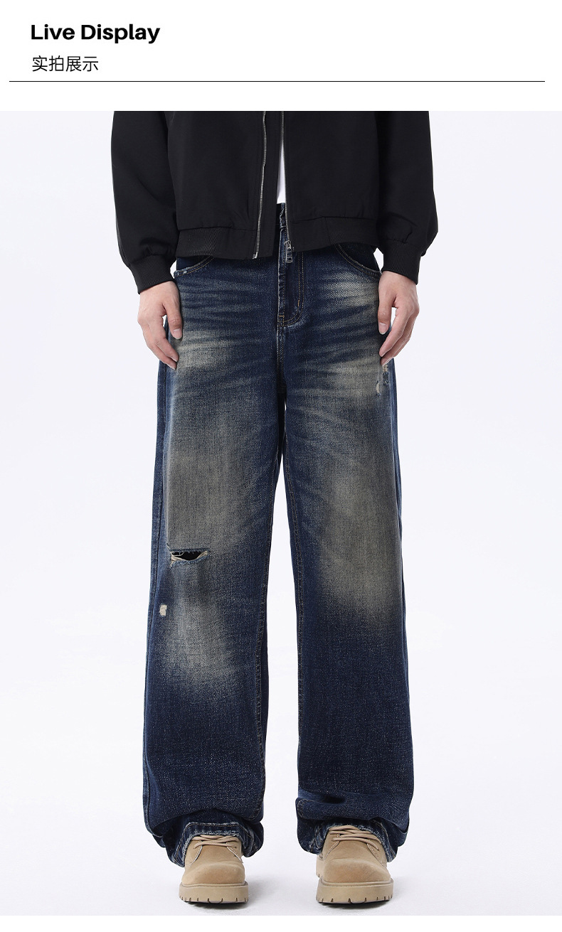 厂家直销男士宽松破洞牛仔裤,复古渐变大直筒设计,秋季休闲风格,多口袋水洗工艺