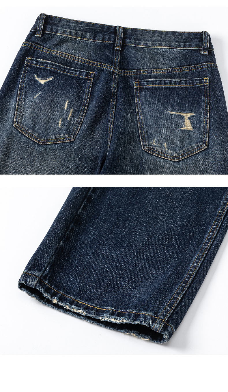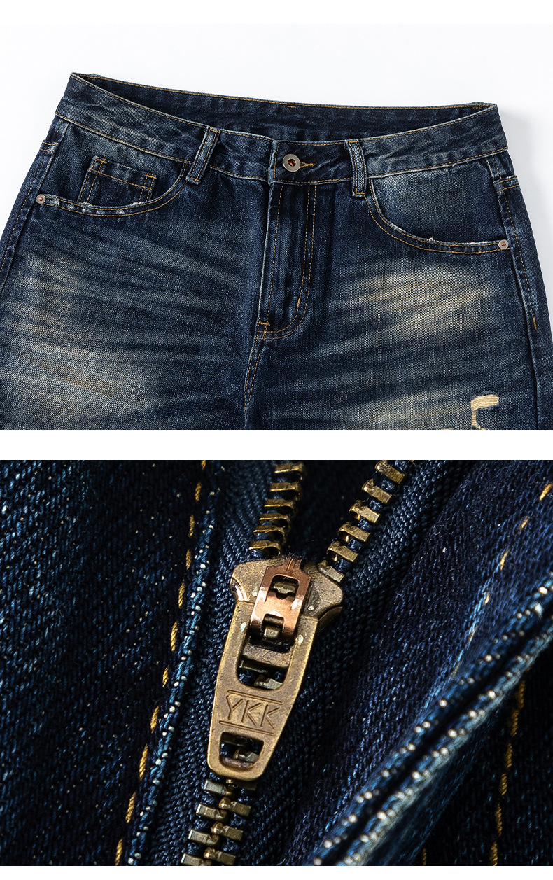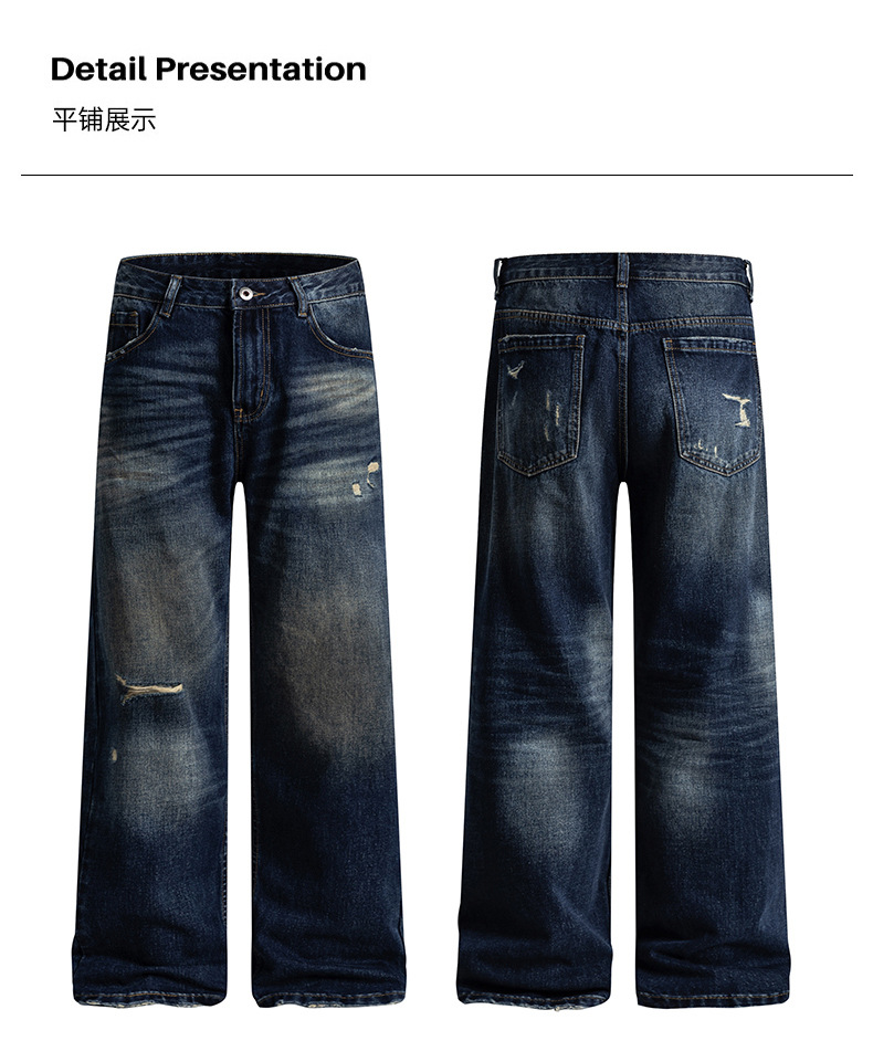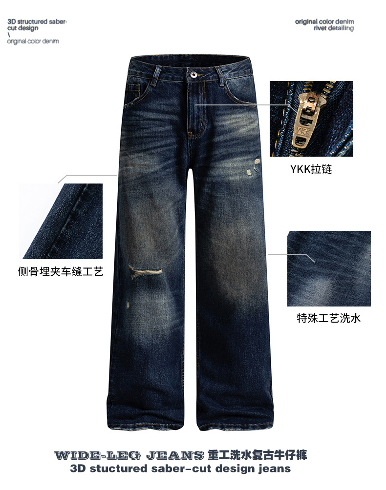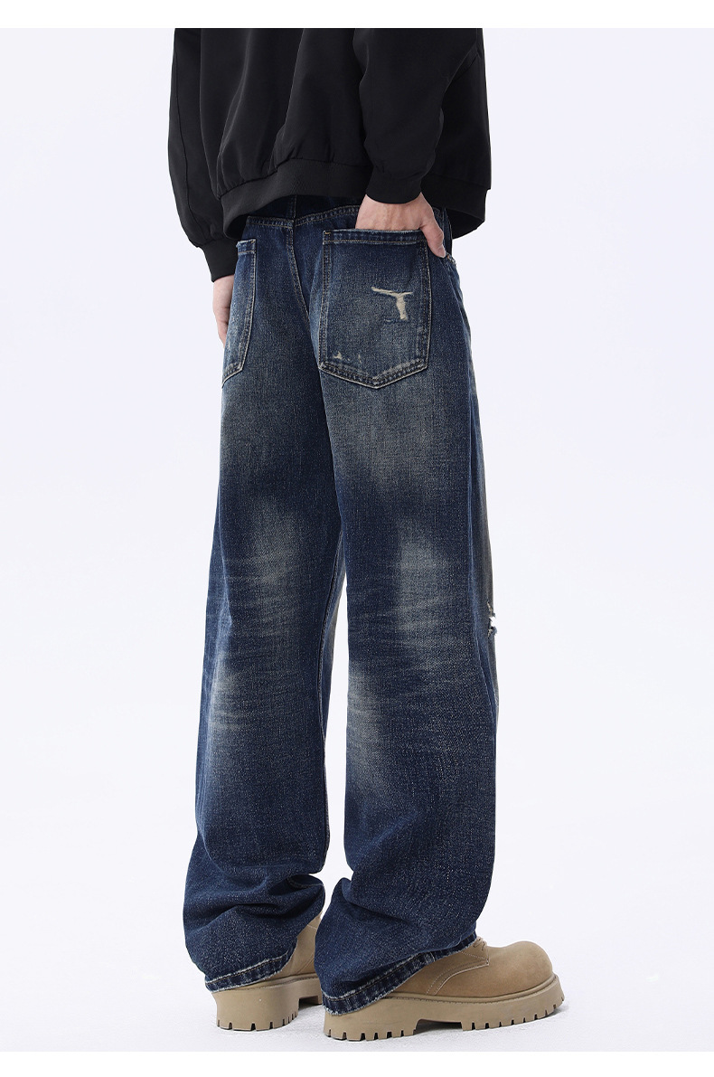 厂家直销男士宽松破洞牛仔裤,复古渐变大直筒设计,秋季休闲风格,多口袋水洗工艺