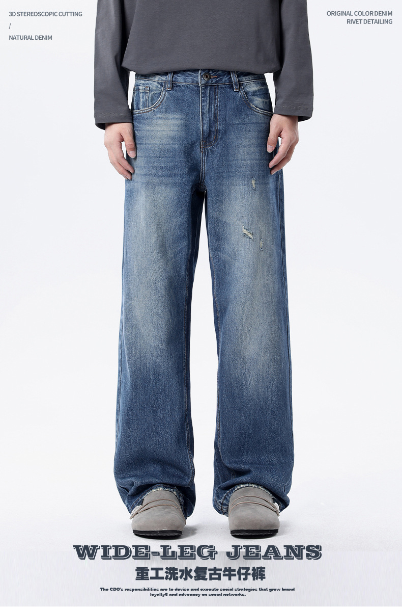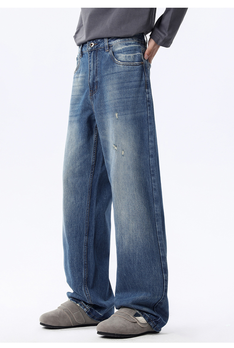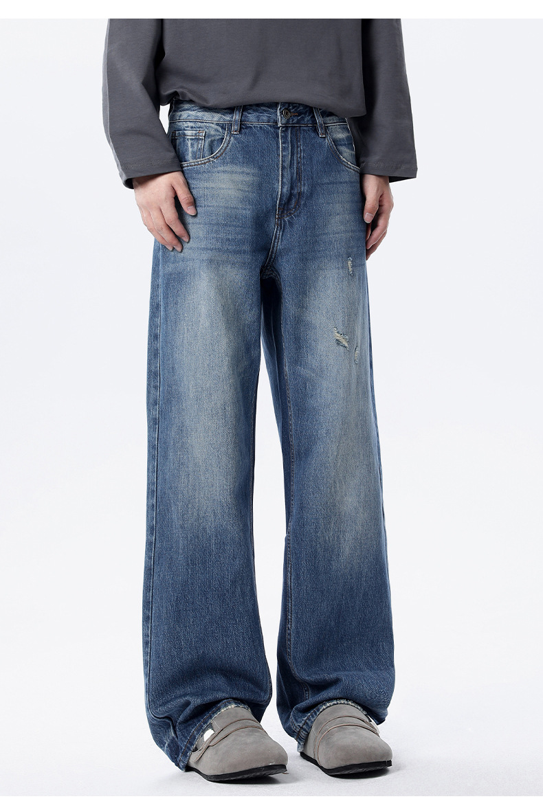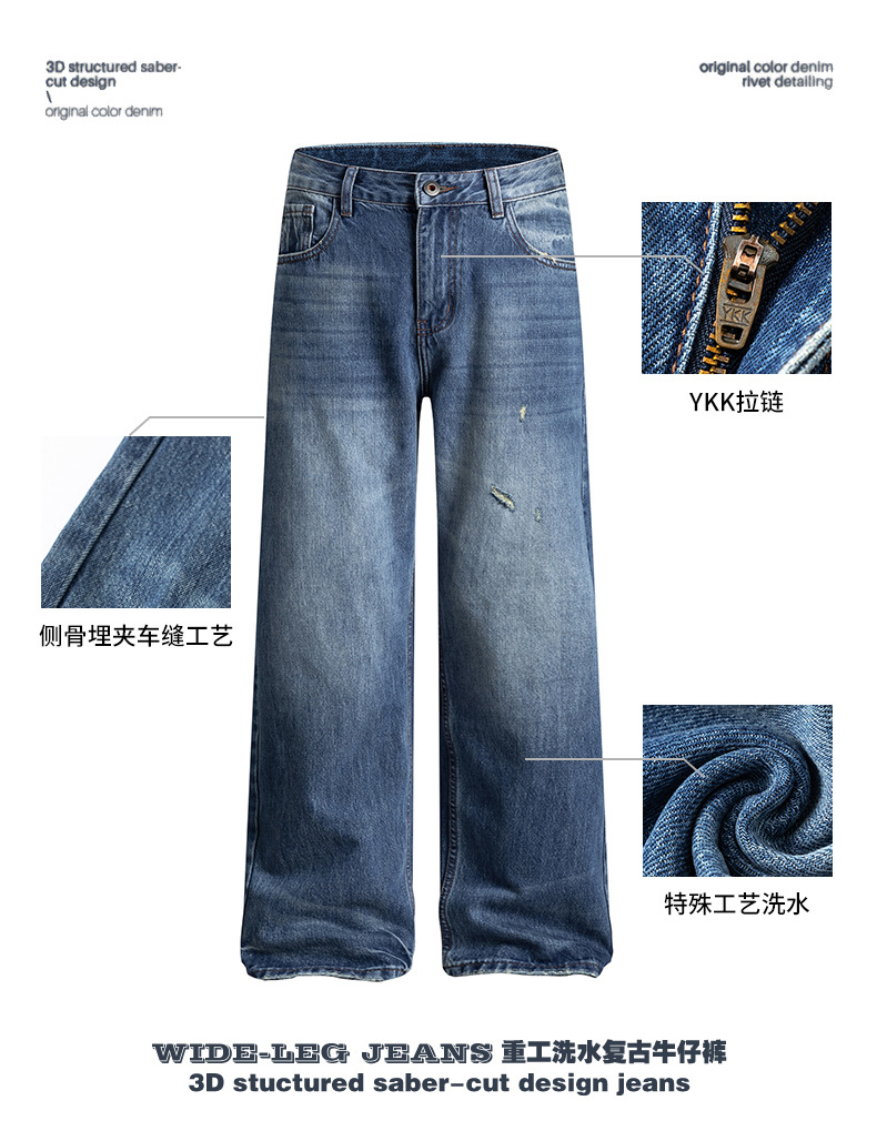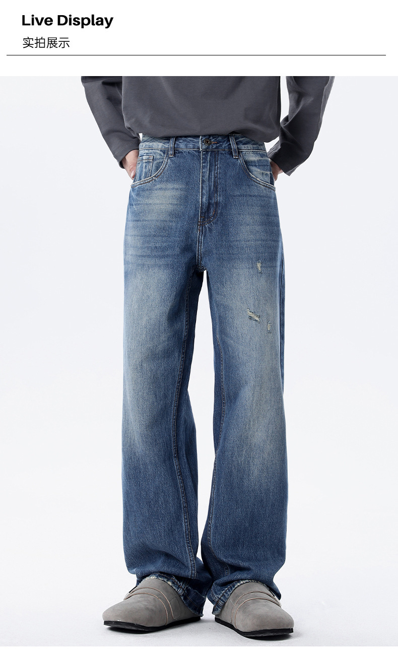 厂家直销男士修身复古蓝色牛仔裤,高街潮流直筒长裤,春秋休闲,水洗磨破设计