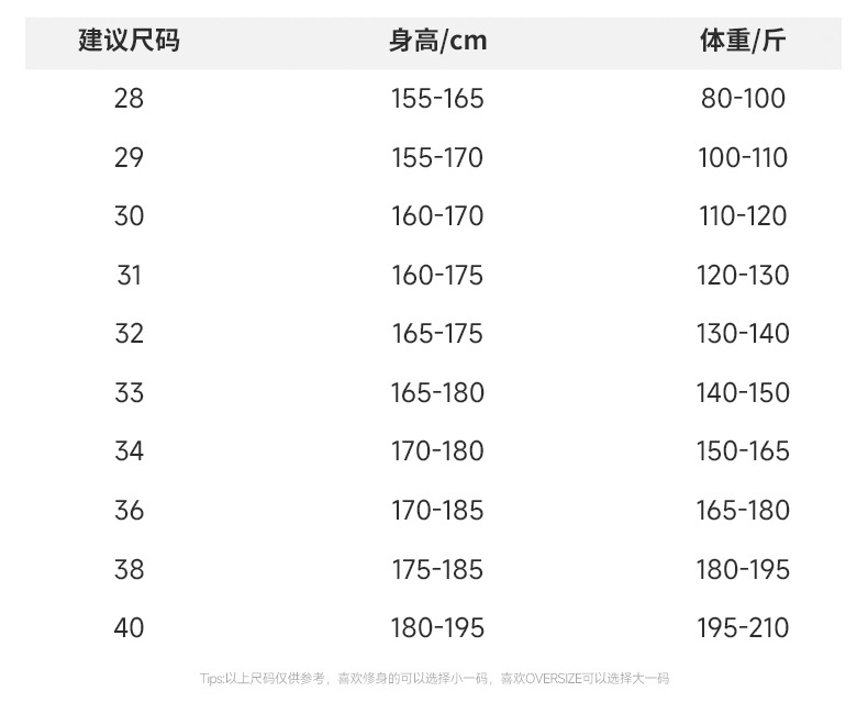 | 尺码 | 28,29,30,31,32,33,34,36,38,40 |