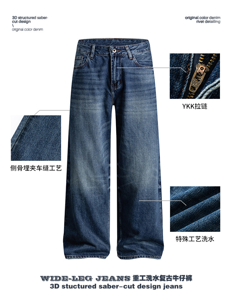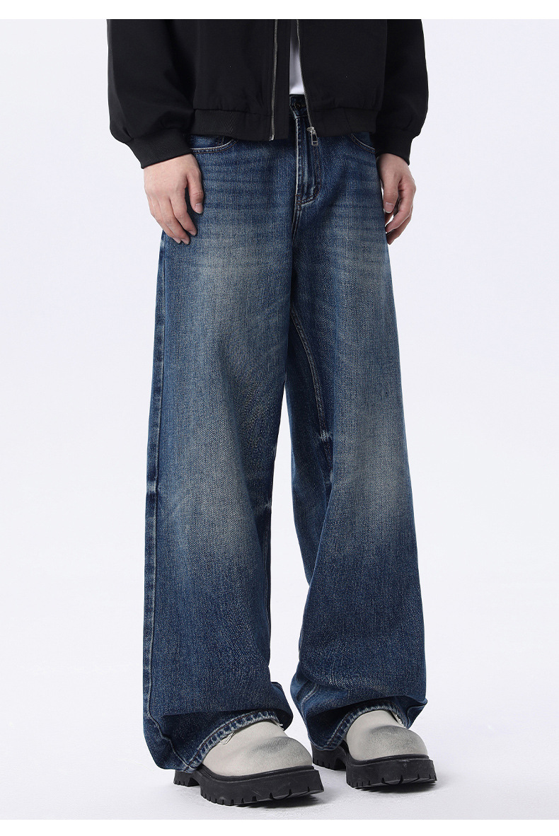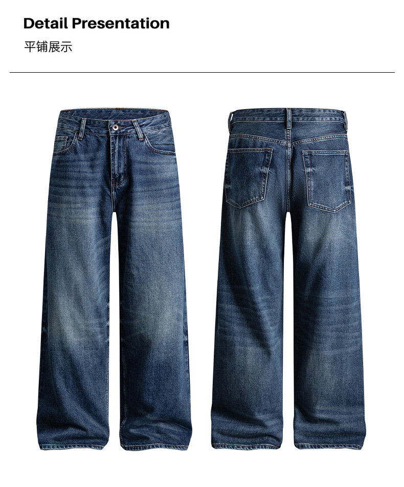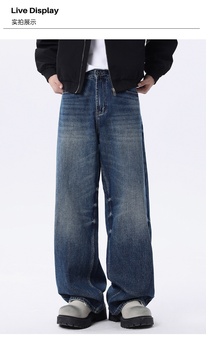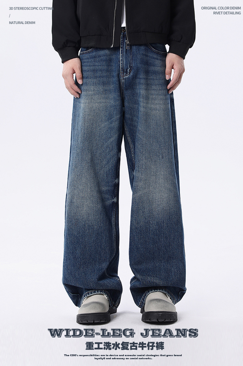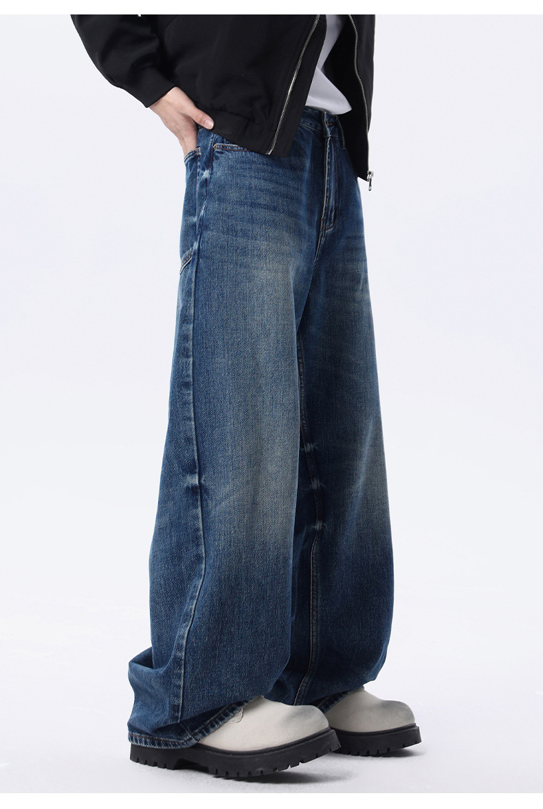 厂家直销男士宽松水洗做旧牛仔裤,深蓝色直筒版型,适合春秋休闲场景,青春流行风格