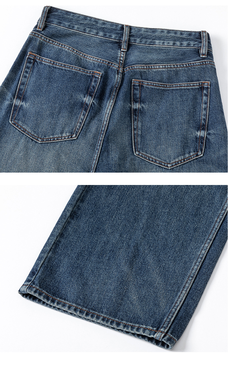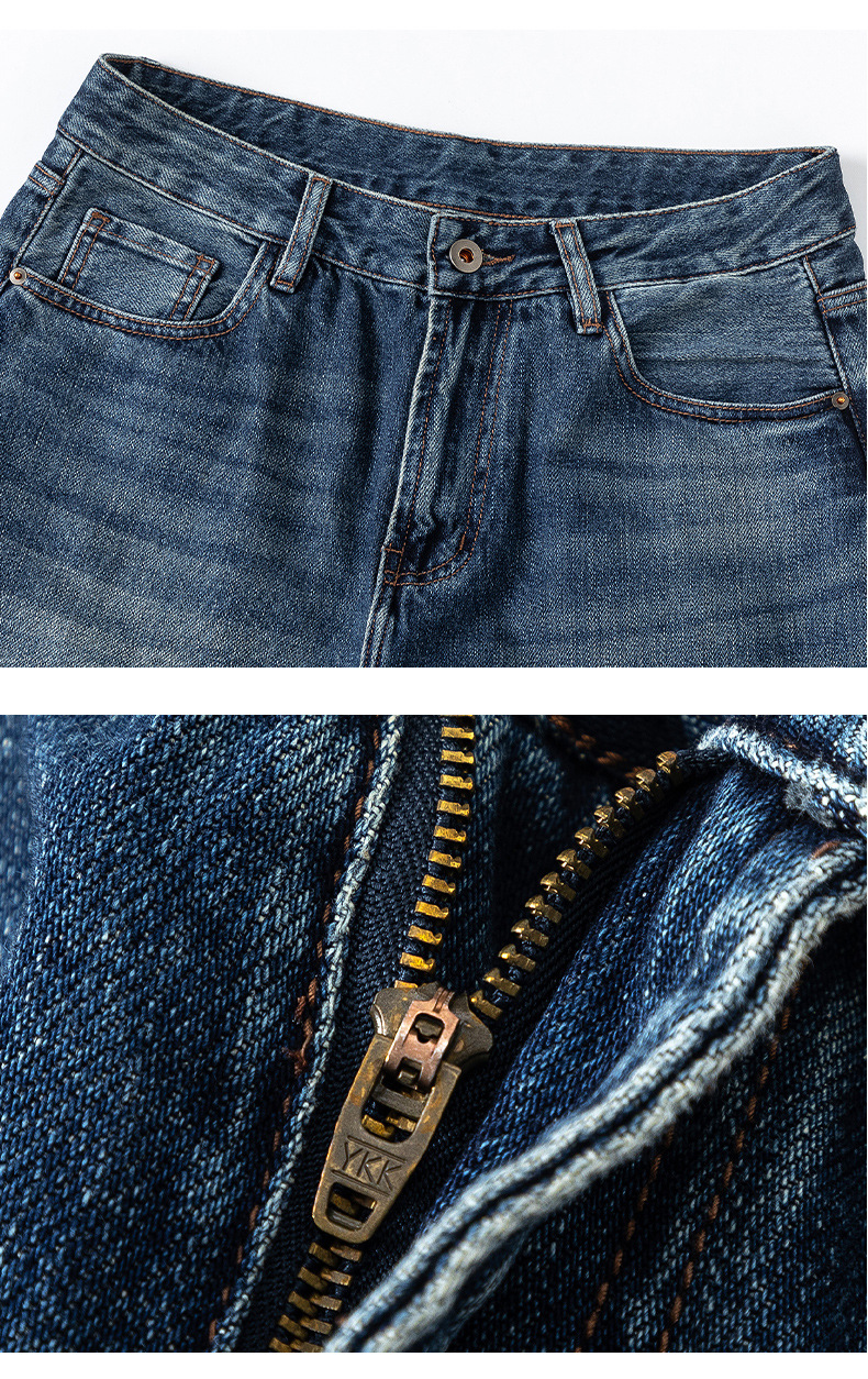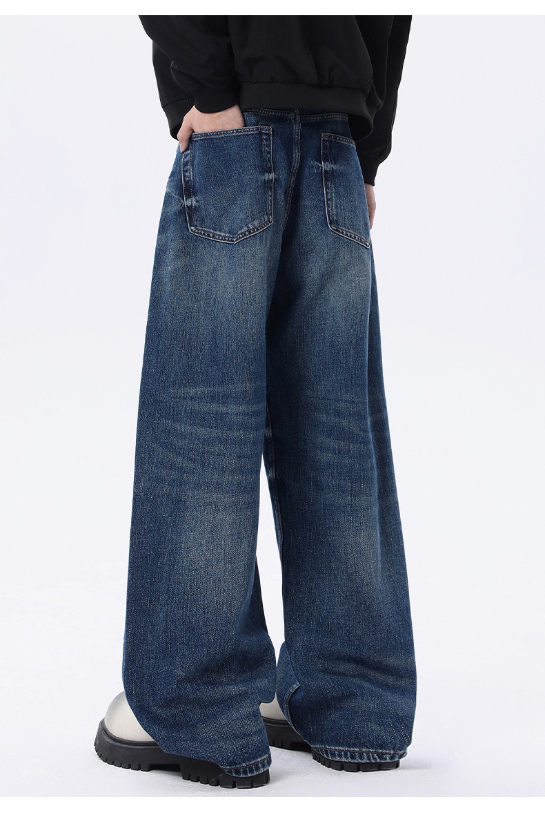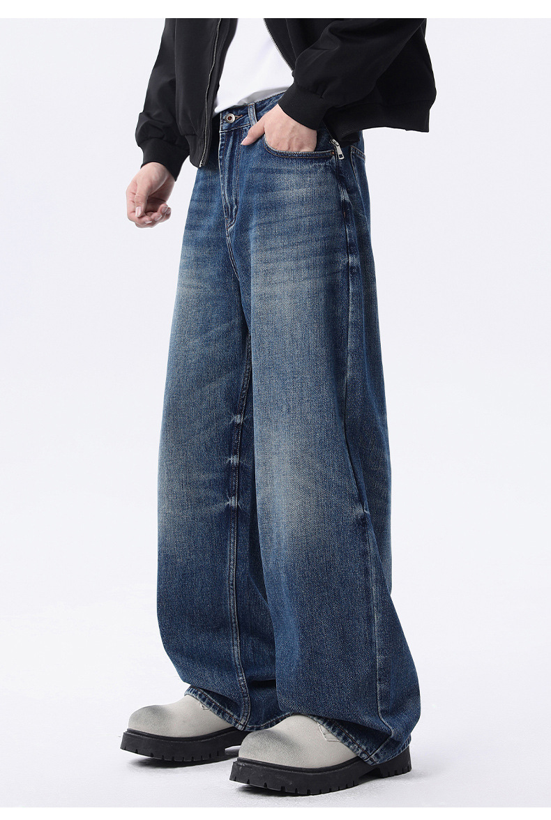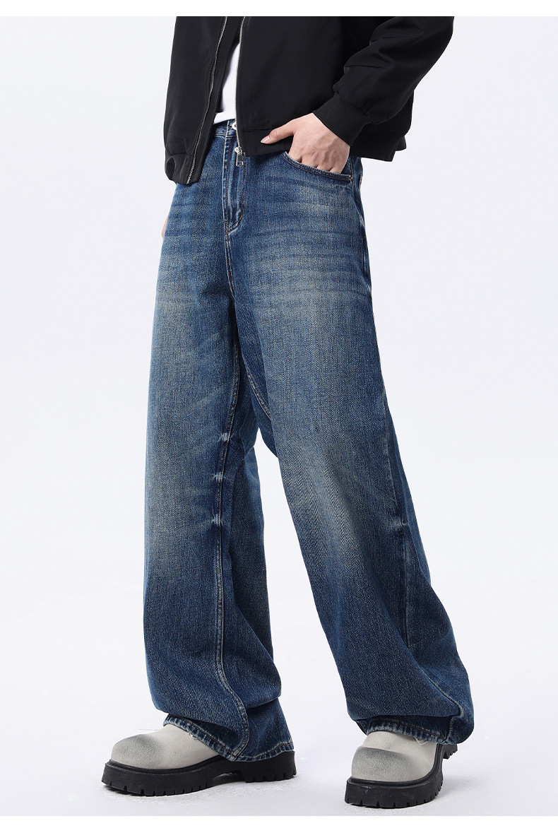厂家直销男士宽松水洗做旧牛仔裤,深蓝色直筒版型,适合春秋休闲场景,青春流行风格