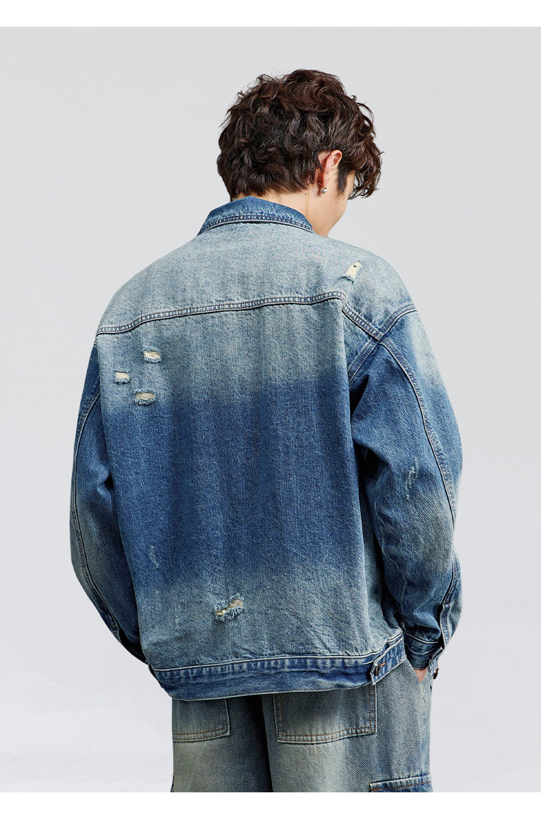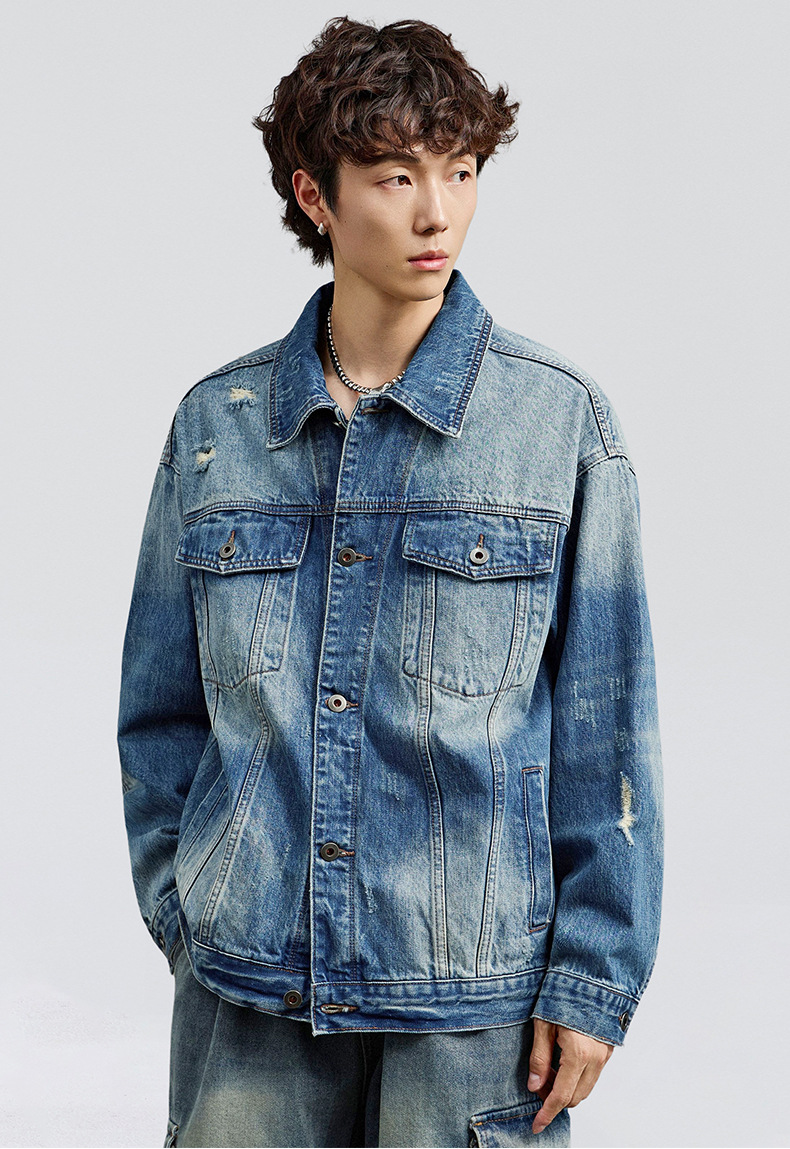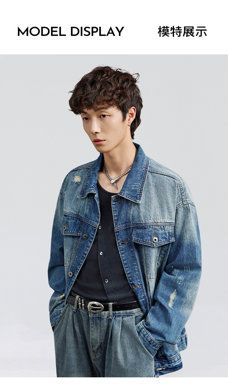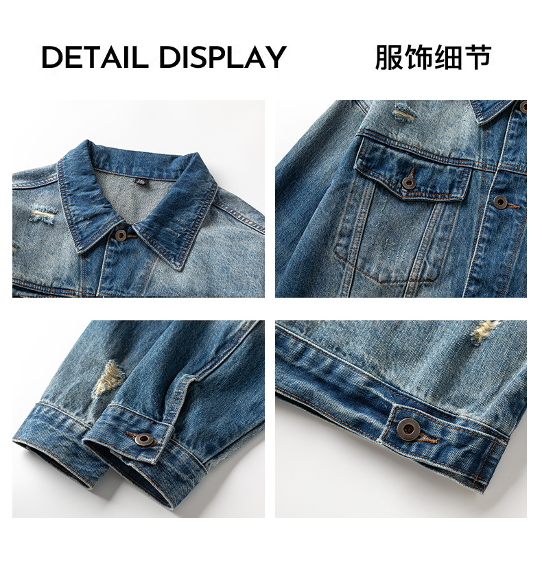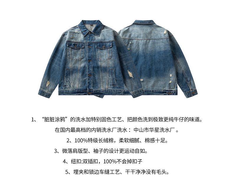 厂家直销男士宽松水洗牛仔外套,复古破洞潮流夹克,春秋休闲,耐磨舒适