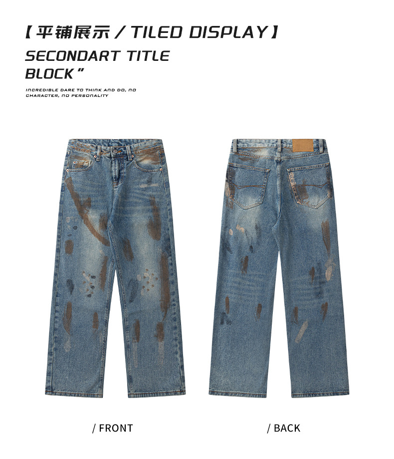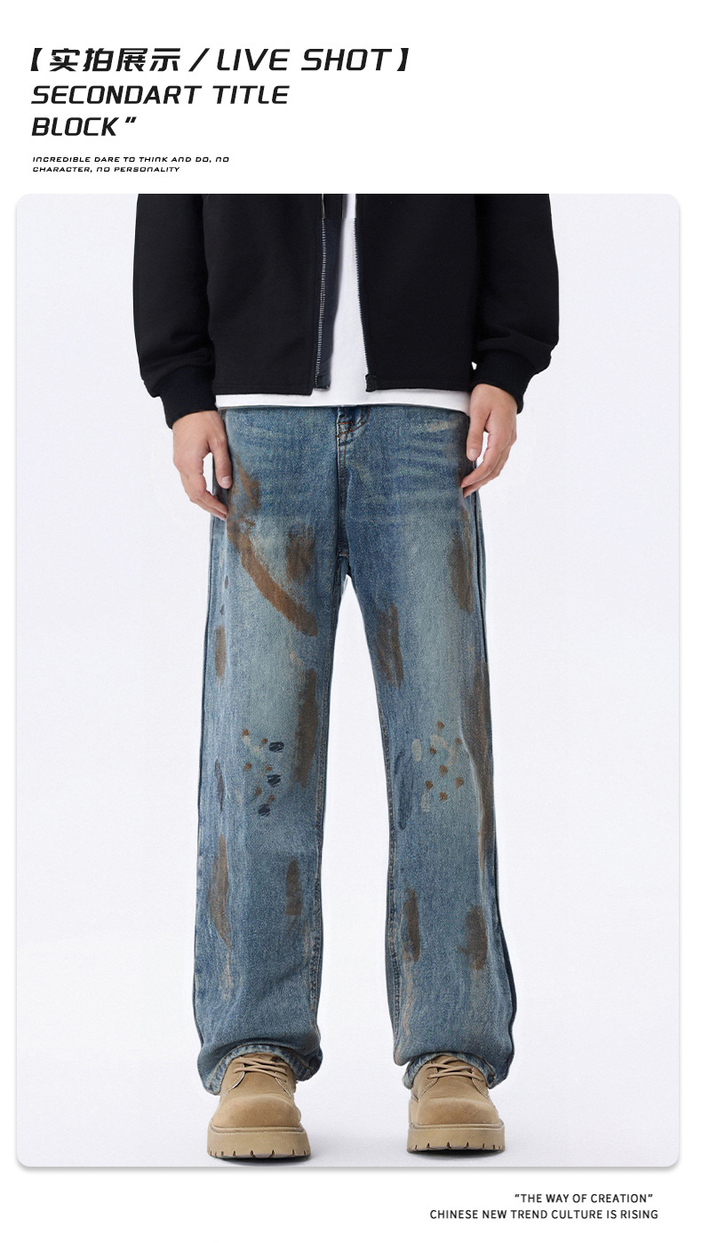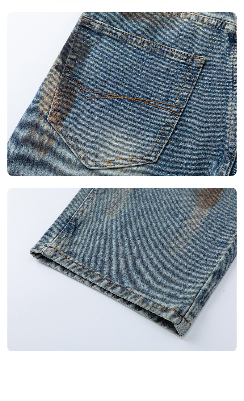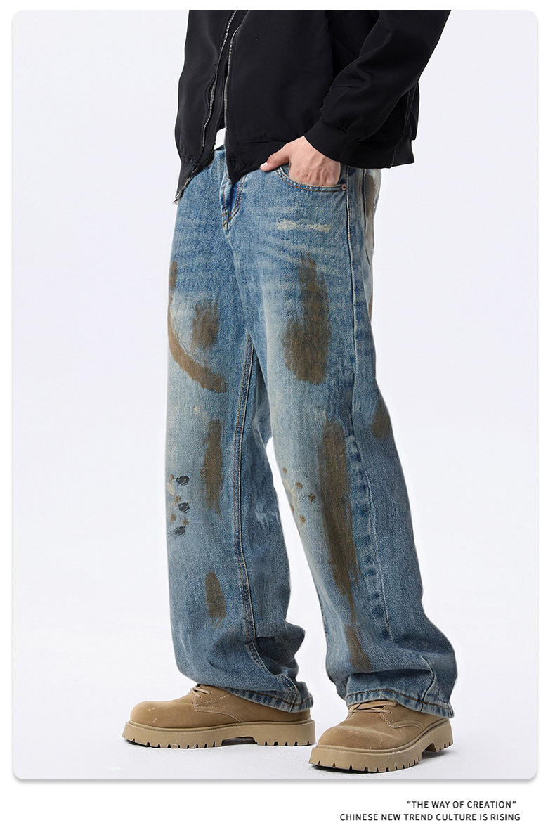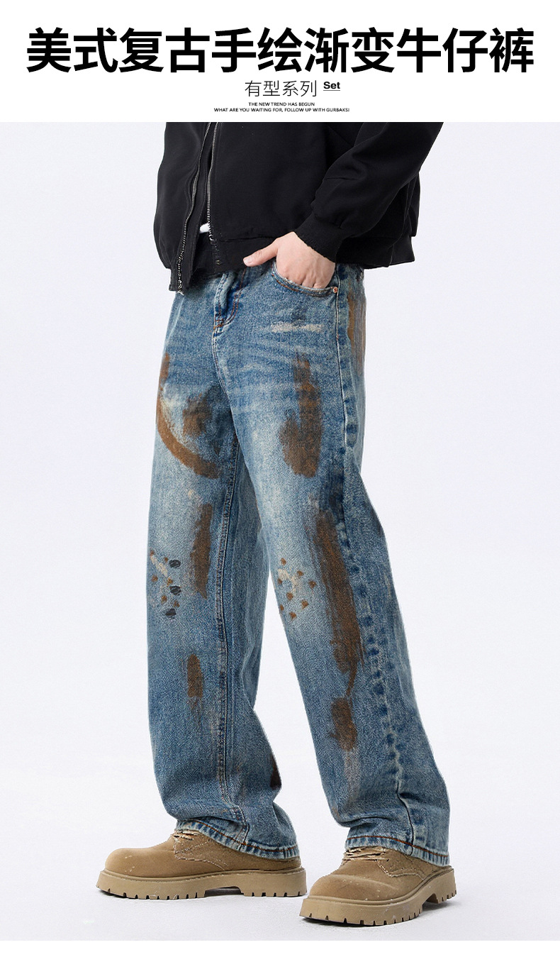 厂家直销男士宽松手绘渐变牛仔裤,春秋休闲风格,直筒型多口袋设计