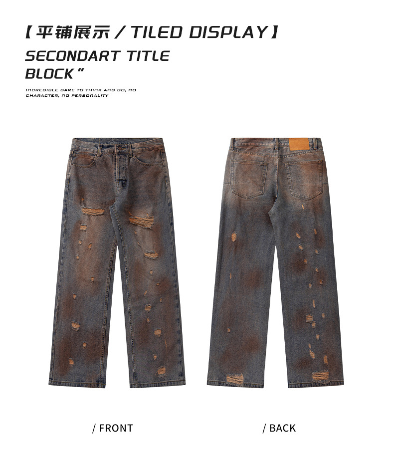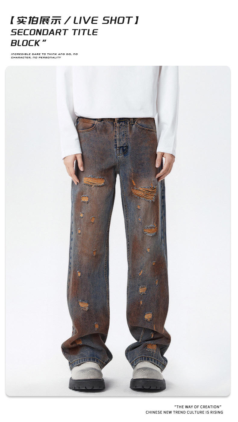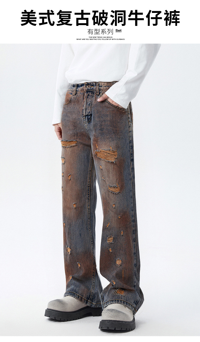 厂家直销青少年牛仔裤,复古渐变水洗直筒,百搭宽松风,春秋季休闲,手工破洞设计