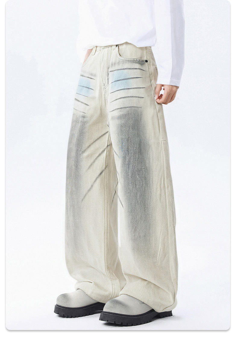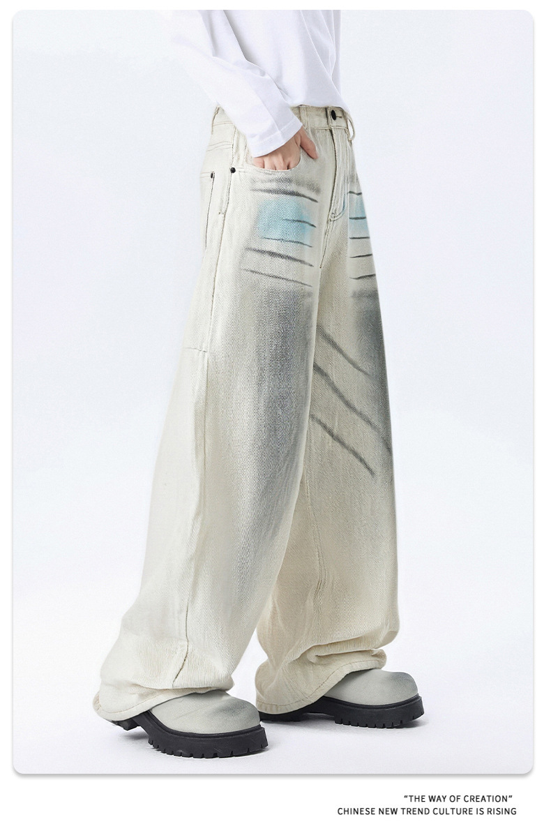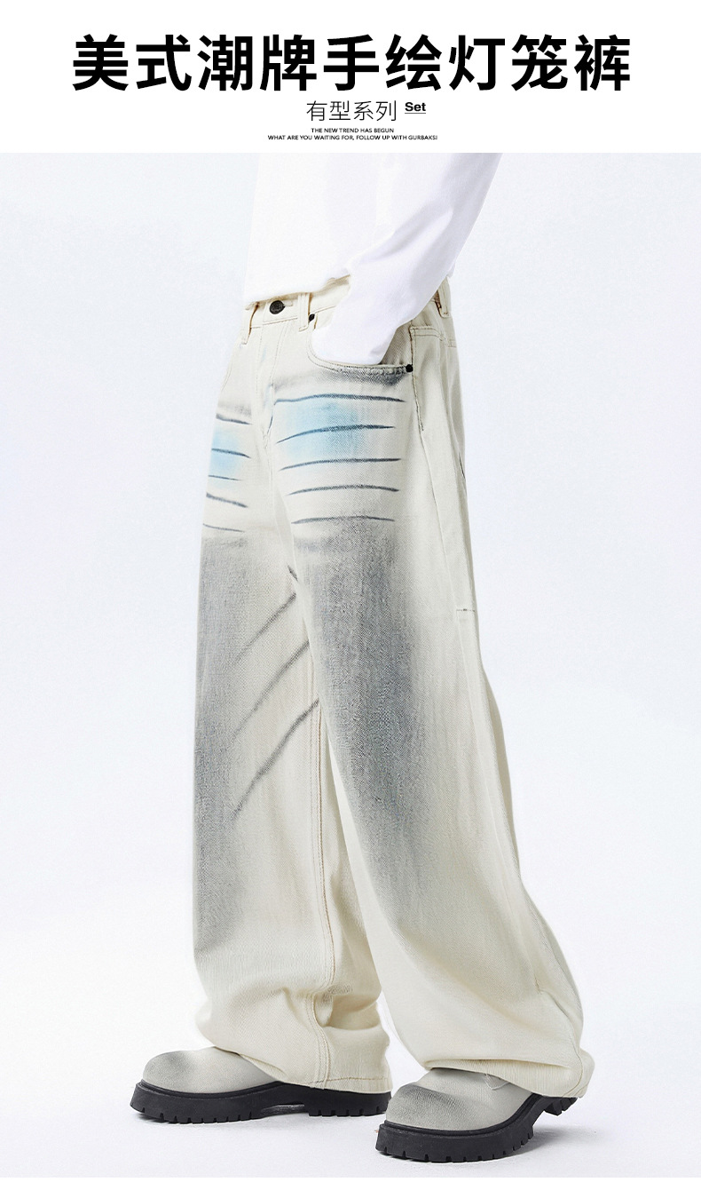 厂家直销男士宽松手绘涂鸦牛仔裤,水洗加厚阔腿裤,秋季休闲街潮风格,多口袋设计