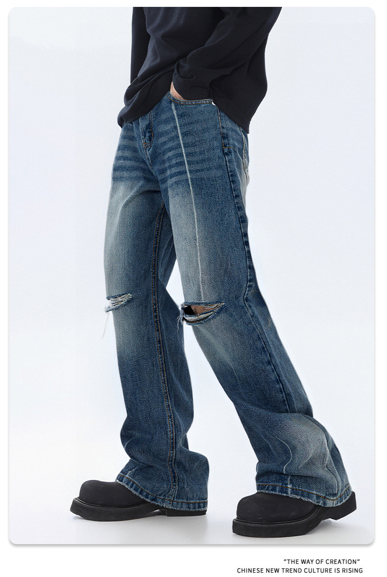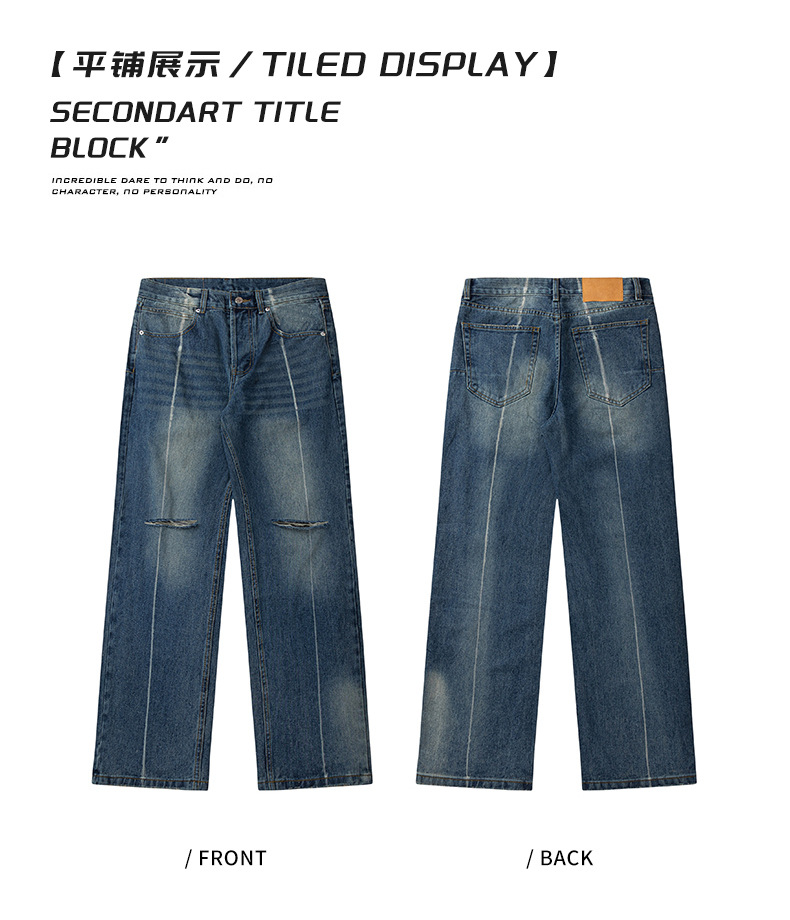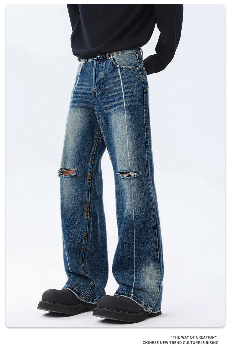 厂家直销青少年修身破洞水洗牛仔裤宽松阔腿长裤,春秋季休闲风格,百搭街潮设计