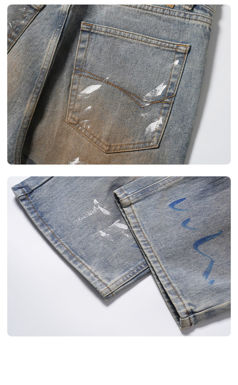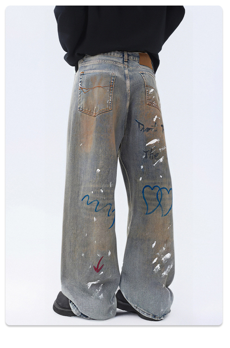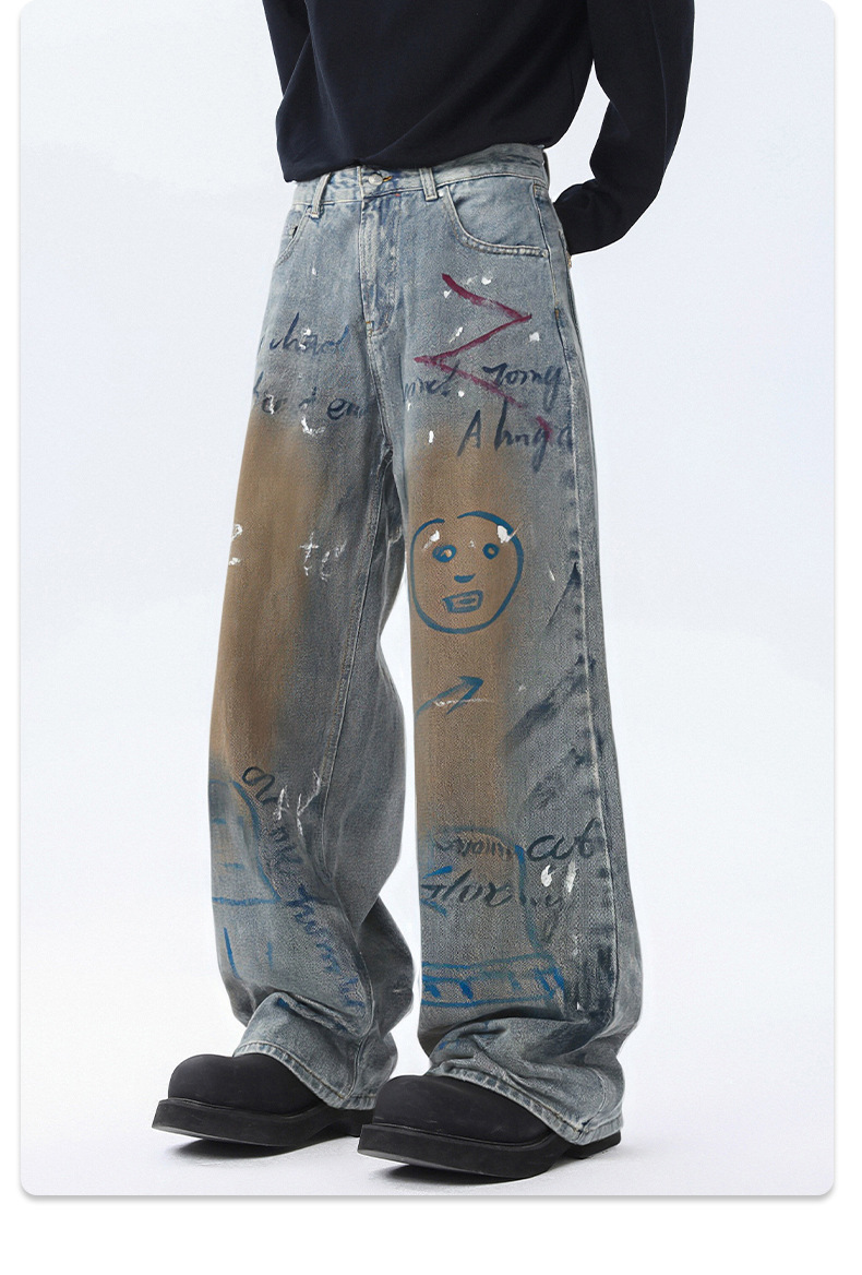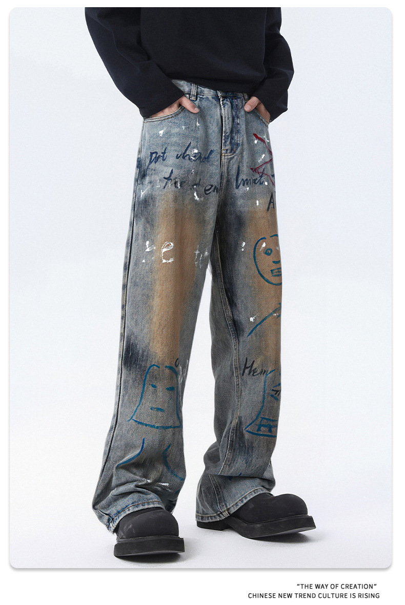 厂家直销男士宽松休闲涂鸦牛仔裤直筒款,春秋季,微弹水洗做旧设计