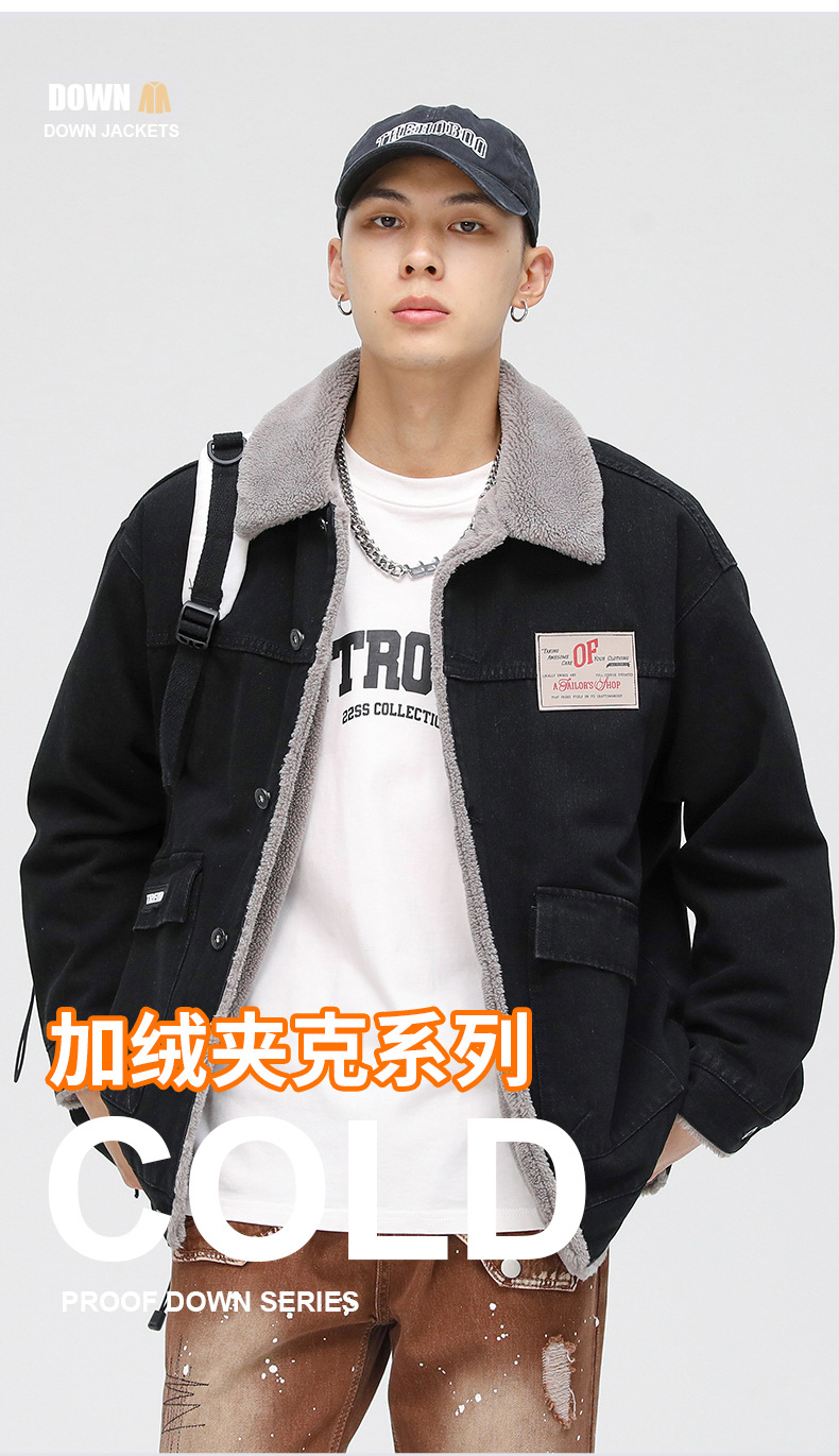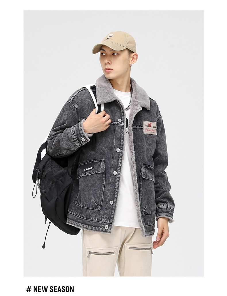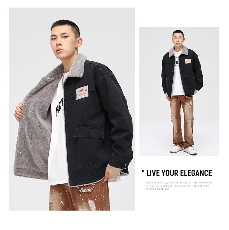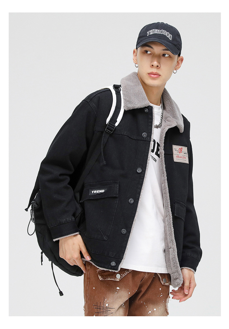 厂家直销男士宽松复古黑白拼色牛仔外套,冬季休闲风格,耐磨立体大口袋设计