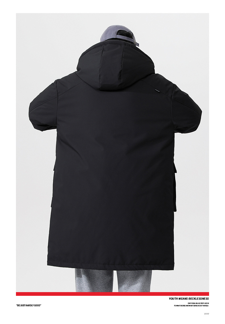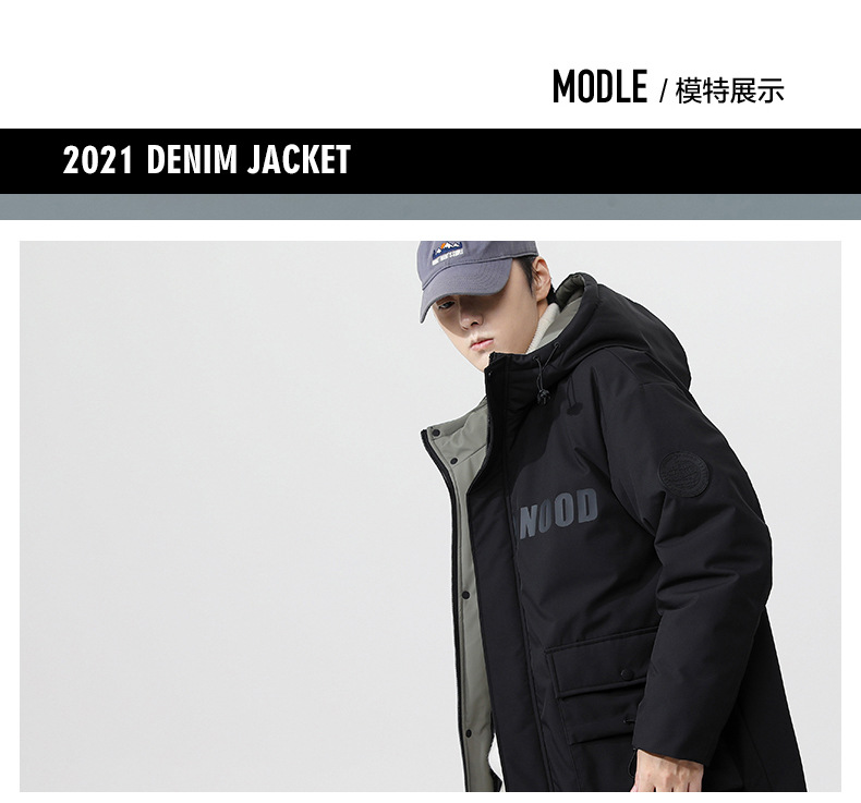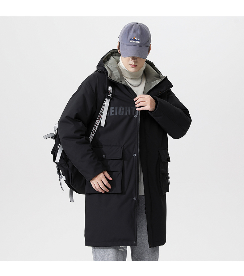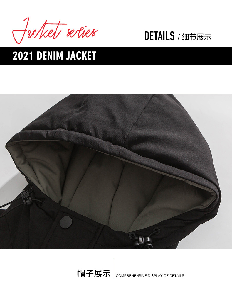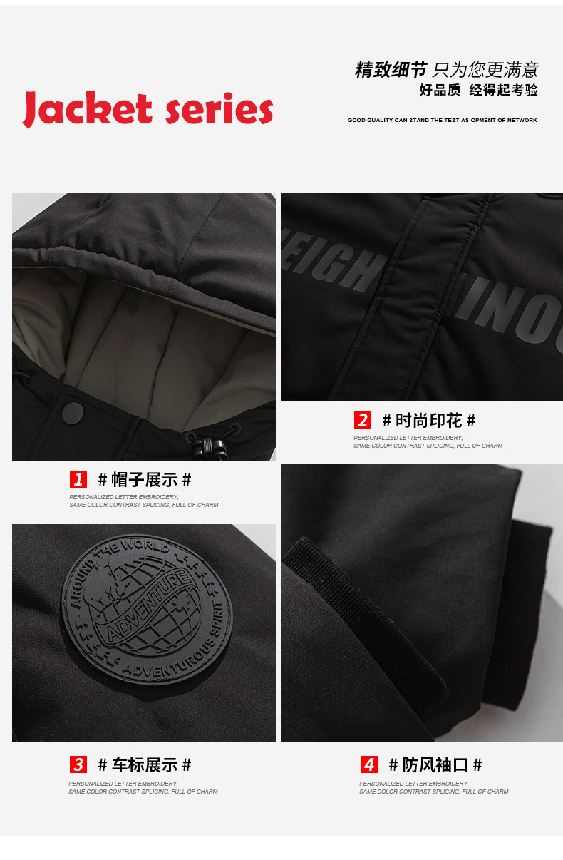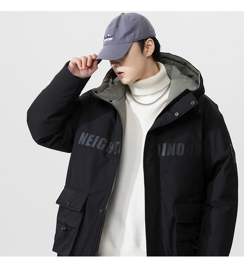 厂家直销青年男士加厚保暖立领黑色连帽羽绒外套,冬季休闲风格,多口袋设计