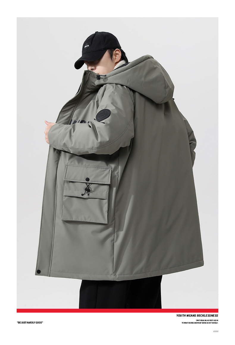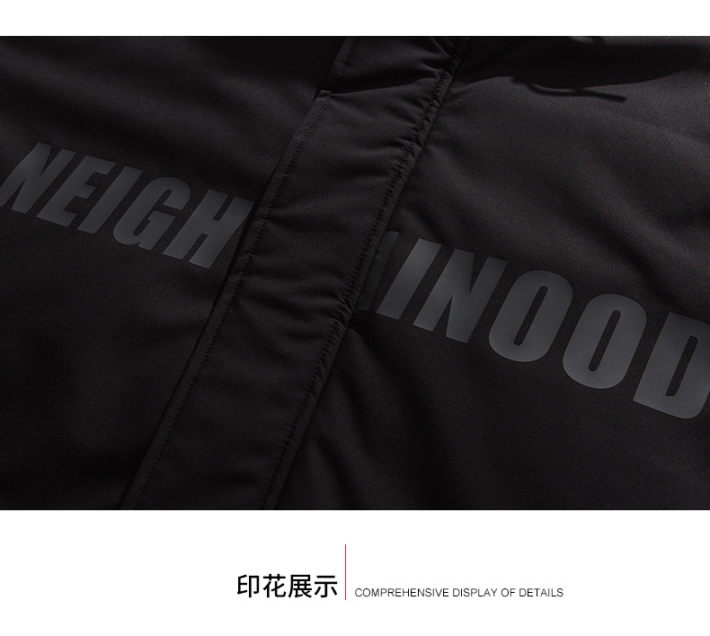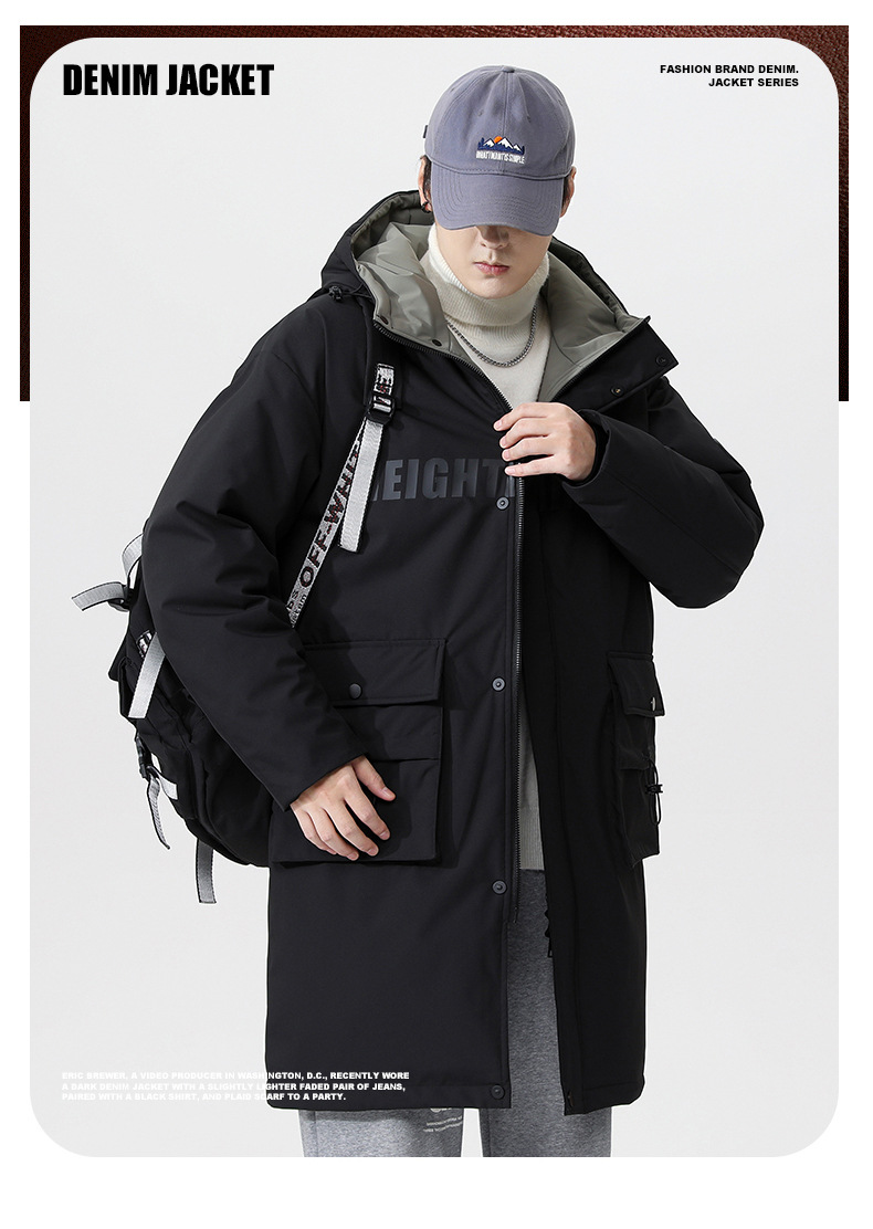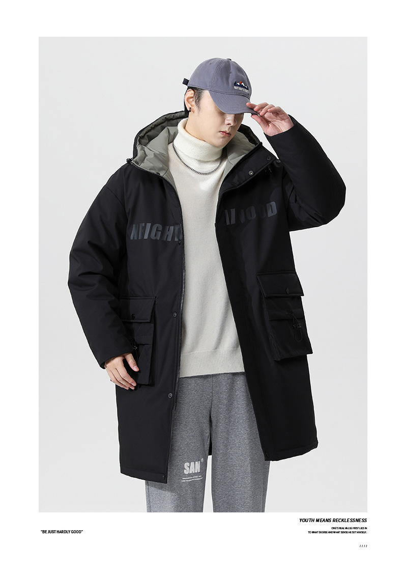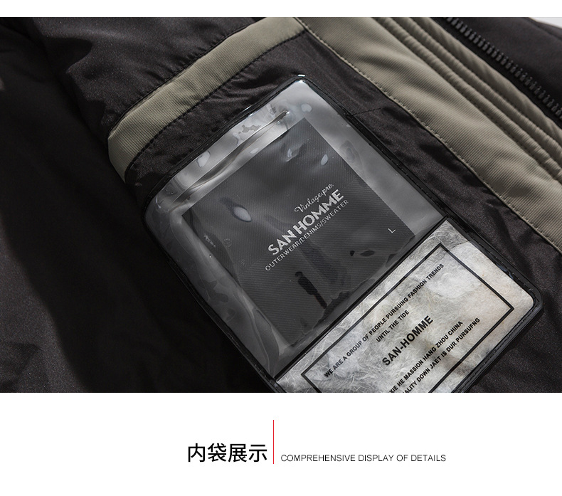 厂家直销青年男士加厚保暖立领黑色连帽羽绒外套,冬季休闲风格,多口袋设计