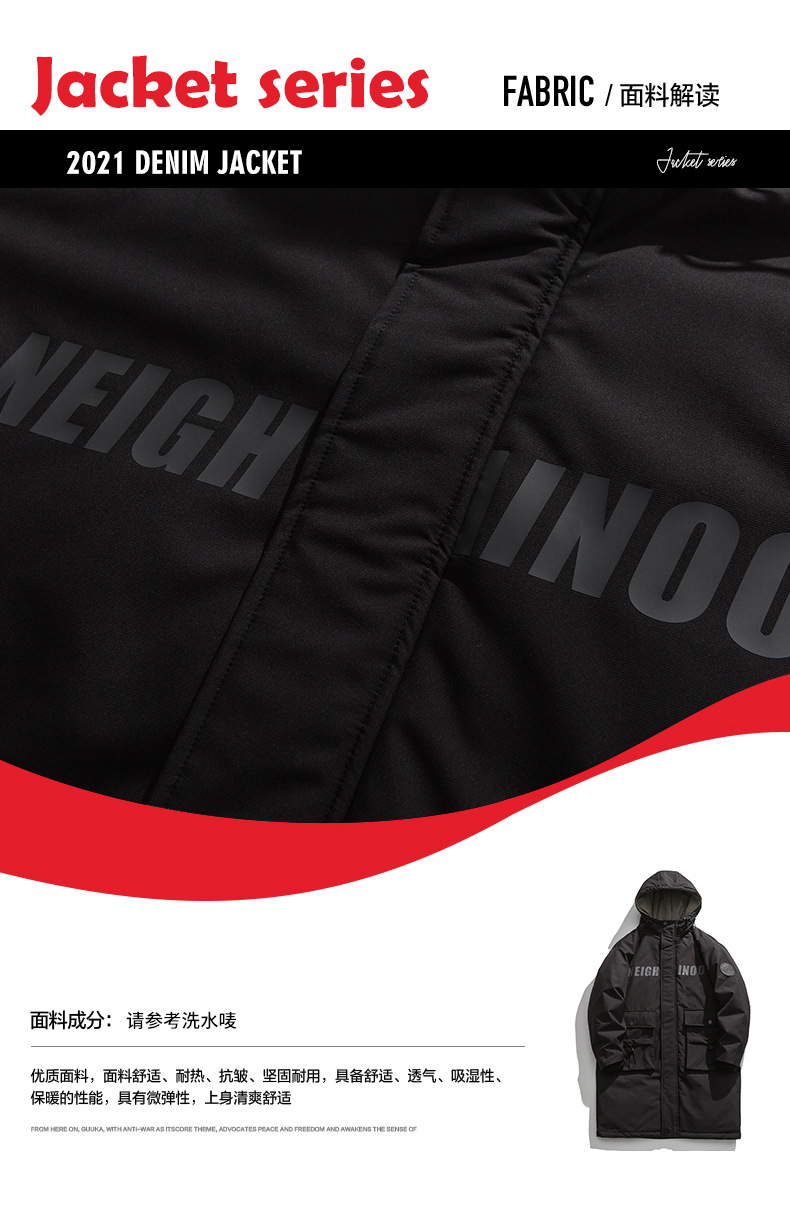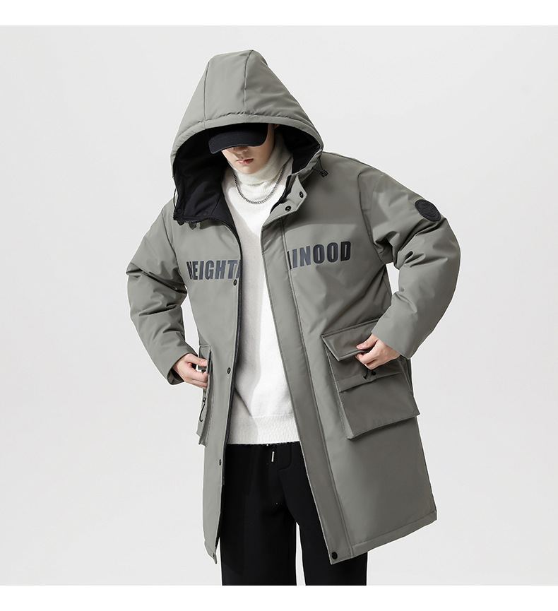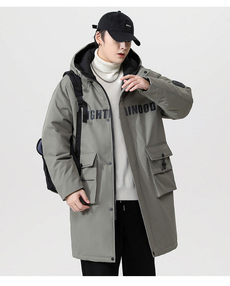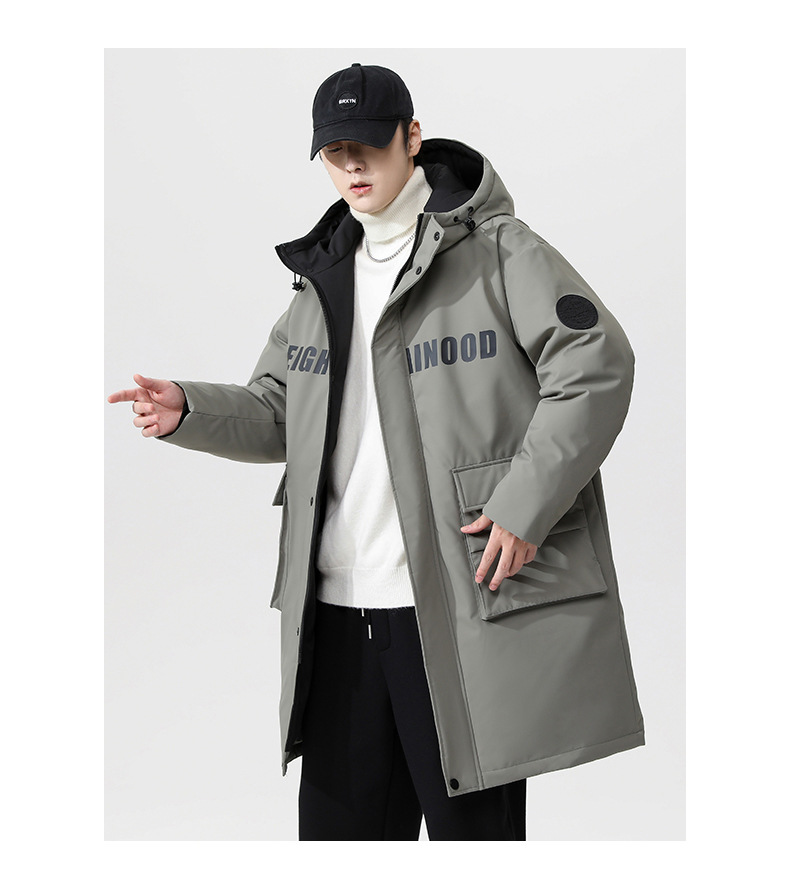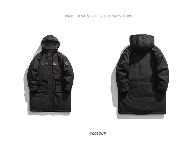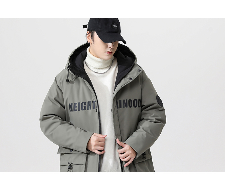 厂家直销青年男士加厚保暖立领黑色连帽羽绒外套,冬季休闲风格,多口袋设计